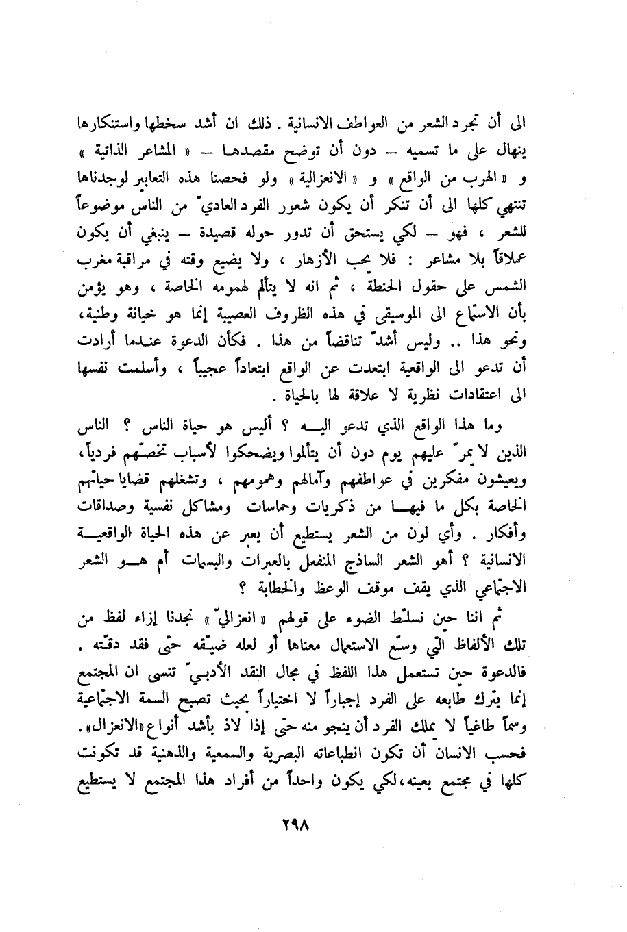 وما هذا الواقع الذي تدعو إليه؟ أليس هو حياة الناس؟ الناس الذين لا يمر عليهم يوم دون أن يتألموا ويضحكوا لأسباب تخصهم فرديًّا، ويعيشون مفكرين في عواطفهم وآمالهم وهمومهم، وتشغلهم قضايا حياتهم الخاصة بكل ما فيها من ذكريات وحماسات ومشاكل نفسية وصداقات وأفكار. وأي لون من الشعر يستطيع أن يعبر عن هذه الحياة الواقعية الإنسانية؟ أهو الشعر الساذج المنفعل بالعبرات والبسمات أم هو الشعر الاجتماعي الذي يقف موقف الوعظ والخطابة؟