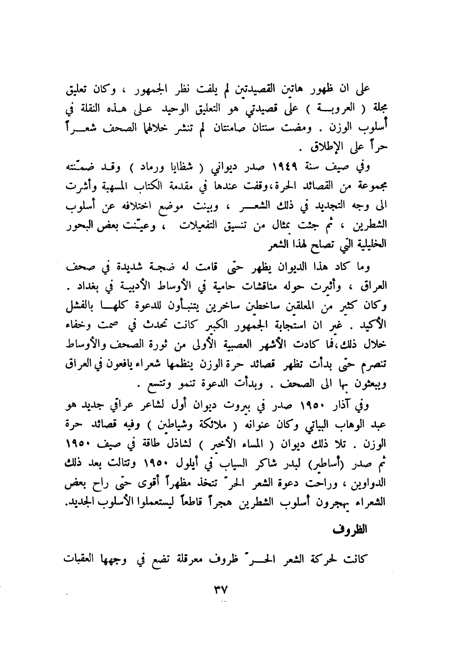 وفي صيف سنة 1949 صدر ديواني "شظايا ورماد" وقد ضمنته مجموعة من القصائد الحرة، وقفت عندها في مقدمة الكتاب المسهبة وأشر إلى وجه التجديد في ذلك الشعر، وبينت موضع اختلافه عن أسلوب الشطرين، ثم جئت بمثال من تنسيق التفعيلات، وعينت بعض البحور الخليلية التي تصلح لهذا الشعر.