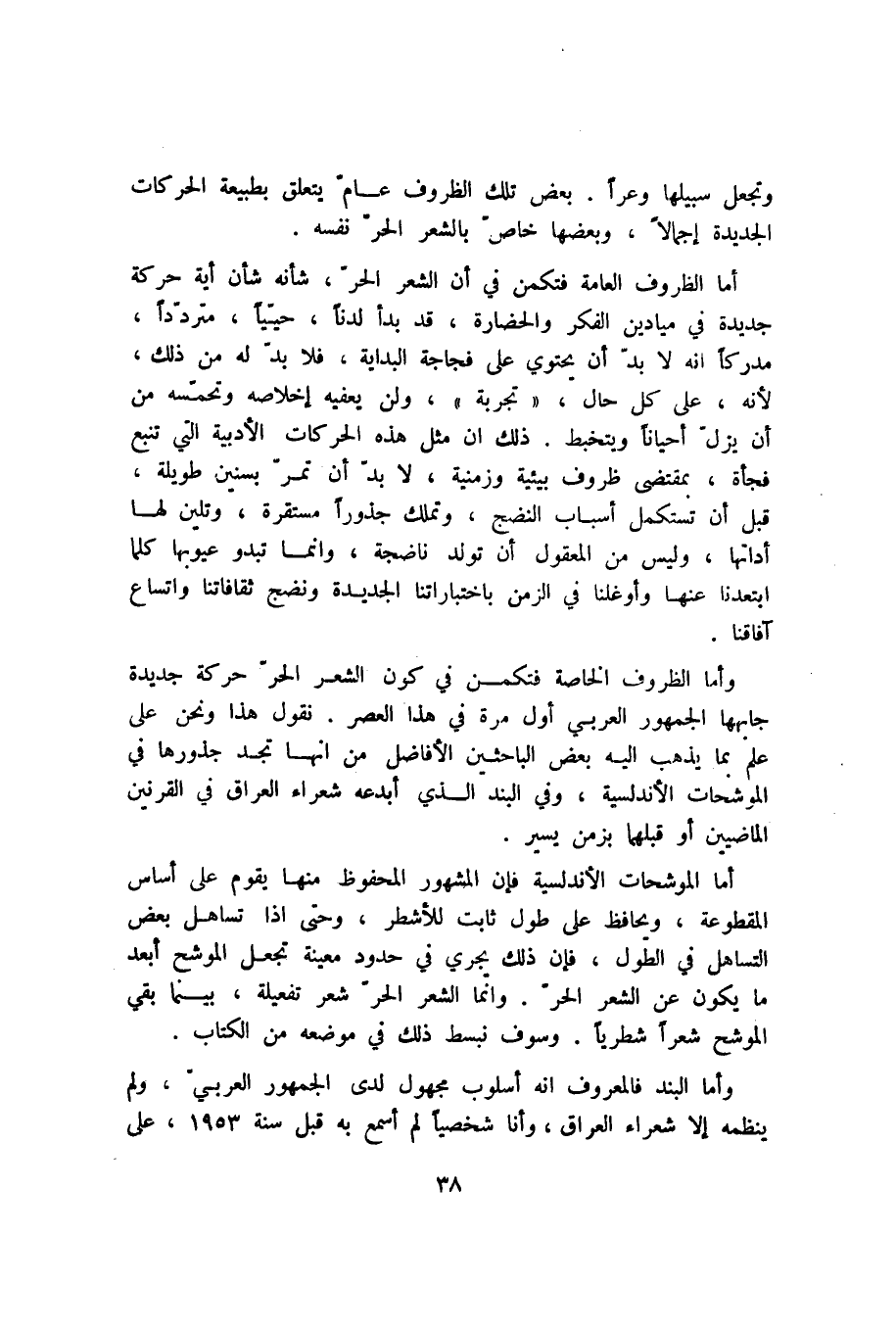 أما الظروف العامة فتكمن في أن الشعر الحر، شأنه شأن أية حركة جديدة في ميادين الفكر والحضارة، قد بدأ لدنًا، حييًا، مترددًا، مدركًا أنه لا بد أن يحتوي على فجاجة البداية، فلا بد له من ذلك؛ لأنه على كل حال، "تجربة"، ولن يعفيه إخلاصه وتحمسه من أن يزل أحيانًا ويتخبط. ذلك أن مثل هذه الحركات الأدبية التي تنبع فجأة، بمقتضى ظروف بيئية وزمنية، لا بد أن تمر بسنين طويلة، قبل أن تستكمل أسباب النضج، وتملك جذورًا مستقرة، وتلين لها أداتها، وليس من المعقول أن تولد ناضجة، وإنما تبدو عيوبها كلما ابتعدنا عنها وأوغلنا في الزمن باختباراتنا الجديدة ونضج ثقافاتنا واتساع آفاقنا.