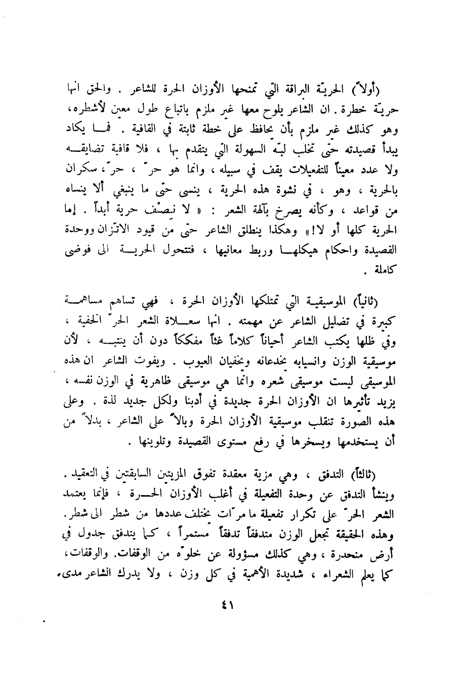 "أولًا" الحرية البراقة التي تمنحها الأوزان الحرة للشاعر. والحق أنها حرية خطرة. أن الشاعر يلوح معها غير ملزم باتباع طول معين لأشطره، وهو كذلك غير ملزم بأن يحافظ على خطة ثابتة في القافية. فما يكاد يبدأ قصيدته حتى تخلب لبه السهولة التي يتقدم بها، فلا قافية تضايقه ولا عدد معينًا للتفعيلات يقف في سبيله، وإنما هو حر، حر، سكران بالحرية، وهو، في نشوة هذه الحرية، ينسى حتى ما ينبغي ألا ينساه من قواعد، وكأنه يصرخ بآلهة الشعر: "لا نصف حرية أبدا. إما الحرية كلها أو لا! " وهكذا ينطلق الشاعر حتى من قيود الاتزان ووحدة القصيدة وأحكام هيكلها وربط معانيها، فتتحول الحرية إلى فوضى كاملة.