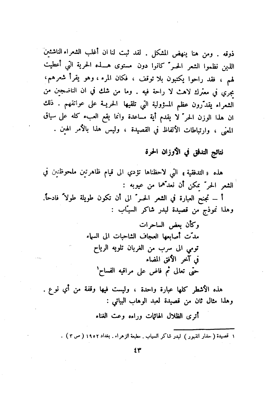 ذوقه. ومن هنا ينهض المشكل. لقد ثبت لنا أن أغلب الشعراء الناشئين الذي نظموا الشعر الحر كانوا دون مستوى هذه الحرية التي أعطيت لهم، فقد راحوا يكتبون بلا توقف، فكان المرء، وهو يقرأ شعرهم يجري في معترك لاهث لا راحة فيه. وما من شك في أن الناضجين من الشعراء يقدرون عظم المسئولية التي تلقيها الحرية على عواتقهم. ذلك أن هذا الوزن الحر لا يقدم أية مساعدة وإنما يقع العبء كله على سياق المعنى، وارتباطات الألفاظ في القصيدة، وليس هذا بالأمر الهين.