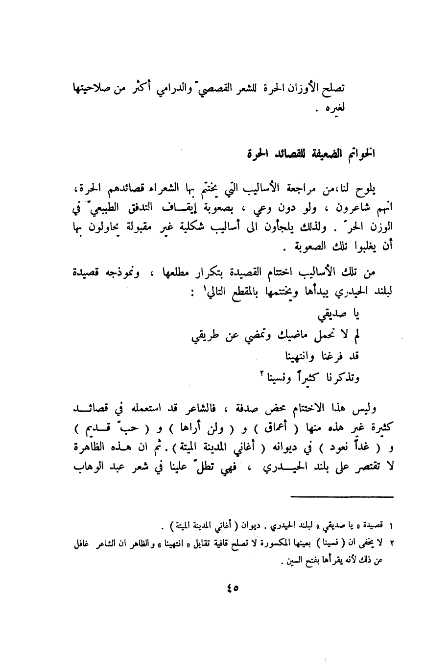 يلوح لنا من مراجعة الأساليب التي يختتم بها الشعراء قصائدهم الحرة أنهم شاعرون، ولو دون وعي، بصعوبة إيقاف التدفق الطبيعي في الوزن الحر. ولذلك يلجئون إلى أساليب شكلية غير مقبولة يحاولون بها أن يغلبوا تلك الصعوبة.