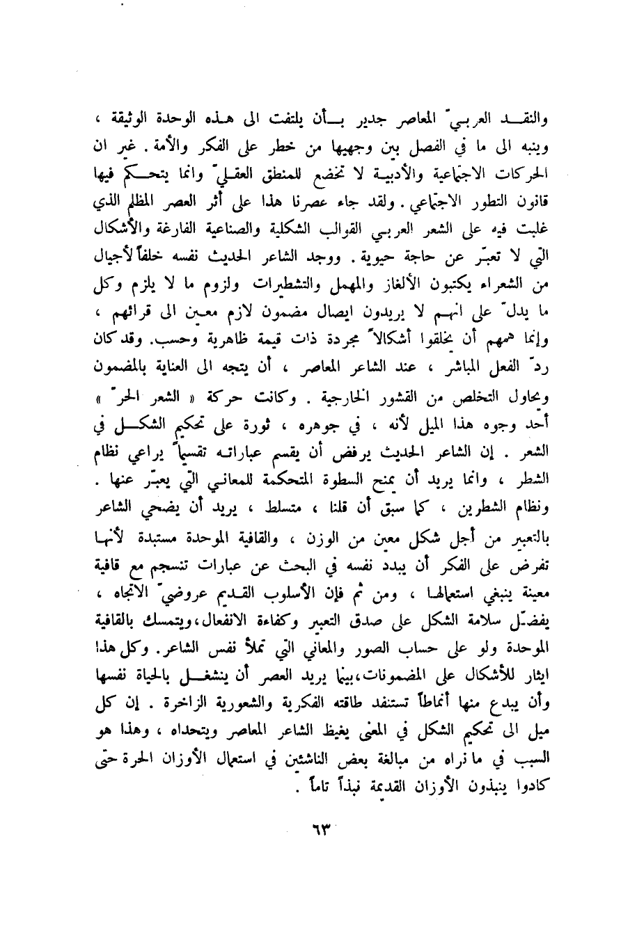 والنقد العربي المعاصر جدير بأن يلتفت إلى هذه الوحدة الوثيقة، وينبه إلى ما في الفصل بين وجهيها من خطر على الفكر والأمة. غير أن الحركات الاجتماعية والأدبية لا تخضع للمنطق العقلي وإنما يتحكم فيها قانون التطور الاجتماعي. ولقد جاء عصرنا هذا على أثر العصر المظلم الذي غلبت فيه على الشعر العربي القوالب الشكلية والصناعية الفارغة والأشكال التي تعبر عن حاجة حيوية. ووجد الشاعر الحديث نفسه خلفًا لأجيال من الشعراء يكتبون الألغاز والمهمل والتشطيرات ولزوم ما لا يلزم وكل ما يدل على أنهم لا يريدون إيصال مضمون لازم معين إلى قرائهم، وإنما همهم أن يخلقوا أشكالًا مجردة ذات قيمة ظاهرية وحسب. وقد كان رد الفعل المباشر، عند الشاعر المعاصر، أن يتجه إلى العناية بالمضمون ويحاول التخلص من القشور الخارجية. وكانت حركة "الشعر الحر" أحد وجوه هذا الميل لأنه، في جوهره، ثورة على تحكيم الشكل في الشعر. إن الشاعر الحديث يرفض أن يقسم عباراته تقسيمًا يراعي نظام الشطر، وإنما يريد أن يمنح السطوة المتحكمة للمعاني التي يعبر عنها.