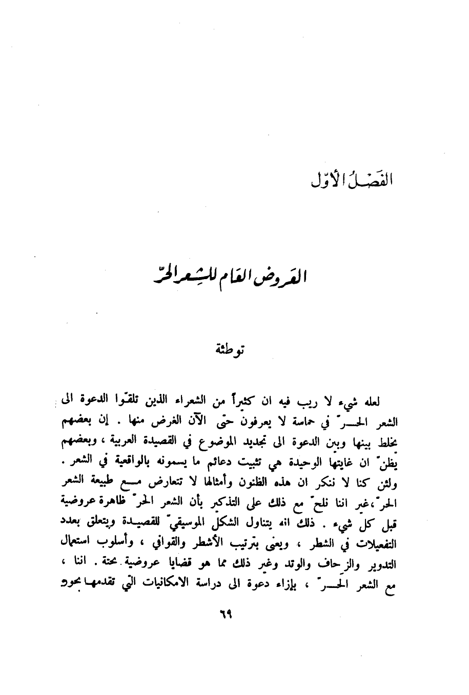 لعله شيء لا ريب فيه أن كثيرًا من الشعراء الذين تلقوا الدعوة إلى الشعر الحر في حماسة لا يعرفون حتى الآن الغرض منها. إن بعضهم يخلط بينها وبين الدعوة إلى تجديد الموضوع في القصيدة العربية، وبعضهم يظن أن غايتها الوحيدة هي تثبيت دعائم ما يسمونه بالواقعية في الشعر. ولئن كنا لا ننكر أن هذه الظنون وأمثالها لا تتعارض مع طبيعة الشعر الحر، غير أننا نلح مع ذلك على التذكير بأن الشعر الحر ظاهرة عروضية قبل كل شيء. ذلك أنه يتناول الشكل الموسيقي للقصيدة ويتعلق بعدد التفعيلات في الشطر، ويعني بترتيب الأشطر والقوافي، وأسلوب استعمال التدوير والزحاف والوتد وغير ذلك مما هو قضايا عروضية بحته، إننا مع الشعر الحر بإزاء دعوة إلى دراسة الإمكانيات التي تقدمها بحور