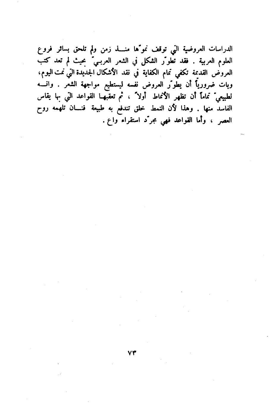 الدراسات العروضية التي توقف نموها منذ زمن ولم تلحق بسائر فروع العلوم العربية. فقد تطور الشكل في الشعر العربي بحيث لم تعد كتب العروض القديمة تكفي تمام الكفاية في نقد الأشكال الجديدة التي نمت اليوم، وبات ضروريًّا أن يطور العروض نفسه ليستطيع مواجهة الشعر. وإنه لطبيعي تمامًا أن تظهر الأنماط أولًا، ثم تعقبها القواعد التي بها يقاس الفاسد منها، وهذا لأن النمط خلق تندفع به طبيعة فنان تلهمه روح العصر، وأما القواعد فهي مجرد استقراء واعٍ.