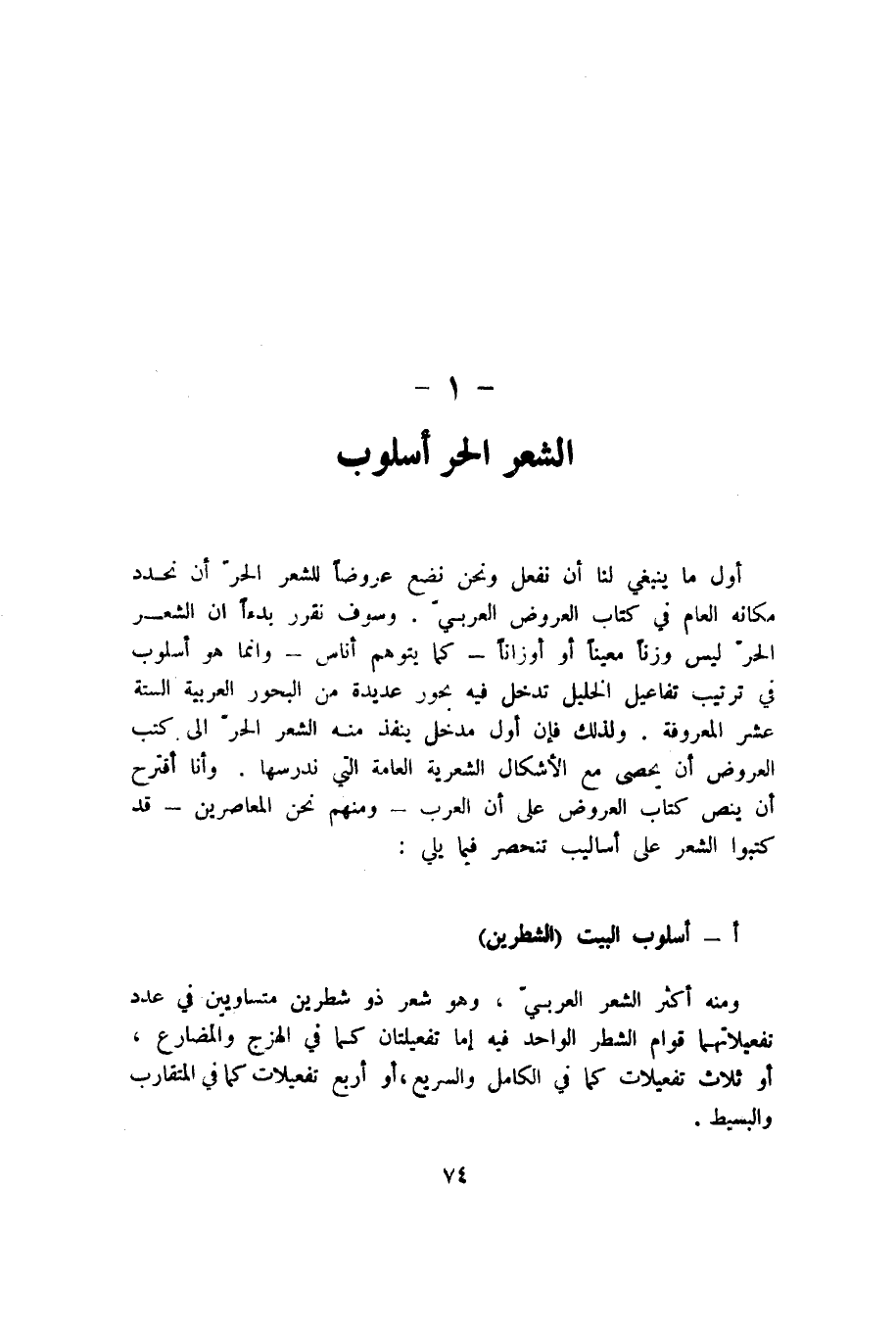أول ما ينبغي لنا أن نفعل ونحن نضع عروضًا للشعر الحر أن نحدد مكانه العام في كتاب العروض العربي. وسوف نقرر بدءًا أن الشعر الحر ليس وزنًا معينًا أو أوزانًا -كما يتوهم أناس- وإنما هو أسلوب في ترتيب تفاعيل الخليل تدخل فيه بحور عديدة من البحور العربية الستة عشر المعروفة. ولذلك فإن أول مدخل ينفذ منه الشعر الحر إلى كتب العروض أن يُحصى مع الأشكال الشعرية العامة التي ندرسها. وأنا أقترح أن ينص كتاب العروض على أن العرب -ومنهم نحن المعاصرين- قد كتبوا الشعر على أساليب تنحصر فيما يلي: