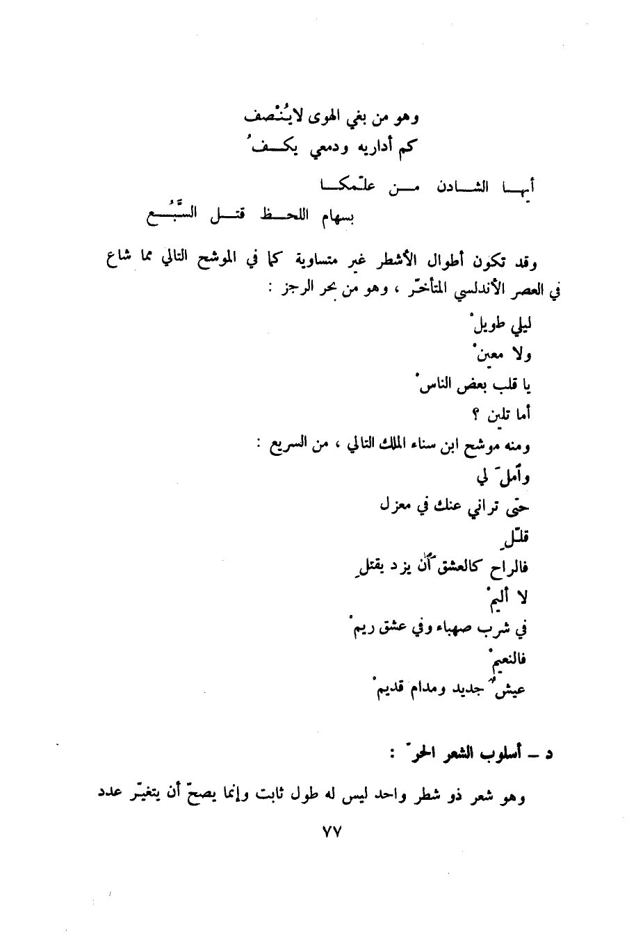 وقد تكون أطوال الأشطر غير متساوية كما في الموشح التالي مما شاع في العصر الأندلسي المتأخر، وهو من بحر الرجز: