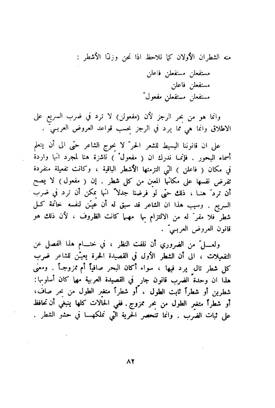 على أن قانوننا البسيط للشعر الحر لا يحوج الشاعر حتى إلى أن يتعلم أسماء البحور. فإنما ندرك أن "مفعولْ" ناشزة هنا لمجرد أنها واردة في مكان "فاعلن" التي التزمتها الأشطر الباقية، وكانت تفعيلة منفردة تفرض نفسها على مكانها المعين من كل شطر. إن "مفعول" لا يصح أن ترد هنا، ذلك حتى لو فرضنا جدلًا أنها يمكن أن ترد في ضرب السريع. وسبب هذا أن الشاعر قد سبق له أن عين لنفسه خاتمة كل شطر فلا مفر له من الالتزام بها مهما كانت الظروف؛ لأن ذلك هو قانون العروض العربي.