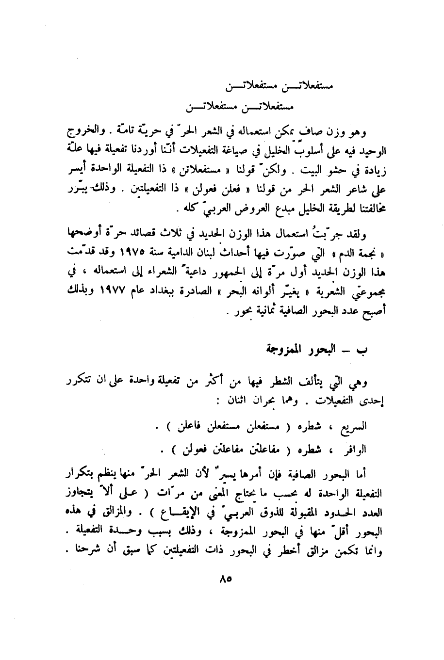 وهو وزن صاف يمكن استعماله في الشعر الحر في حرية تامة. والخروج الوحيد فيه على أسلوب الخليل في صياغة التفعيلات أننا أوردنا تفعيلة فيها علة زيادة في حشو البيت. ولكن قولنا "مستفعلاتن" ذا التفعيلة الواحدة أيسر على شاعر الشعر الحر من قولنا "فعلن فعولن" ذا التفعيلتين. وذلك يبرر مخالفتنا لطريقة الخليل مبدع العروض العربي كله.