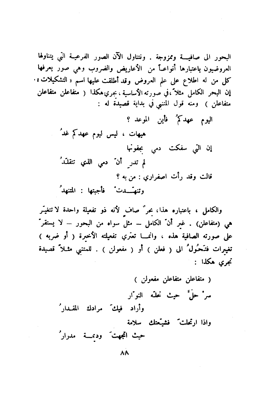 البحور إلى صافية وممزوجة. ونتناول الآن الصور الفرعية التي يتناولها العروضيون باعتبارها أنواعًا من الأعاريض والضروب وهي صور يعرفها كل من له اطلاع على علم العروض وقد أطلقت عليها اسم "التشكيلات". إن البحر الكامل مثلًا في صورته الأساسية، يجري هكذا "متفاعلن متفاعلن متفاعلن" ومنه قول المتنبي في بداية قصيدة له: