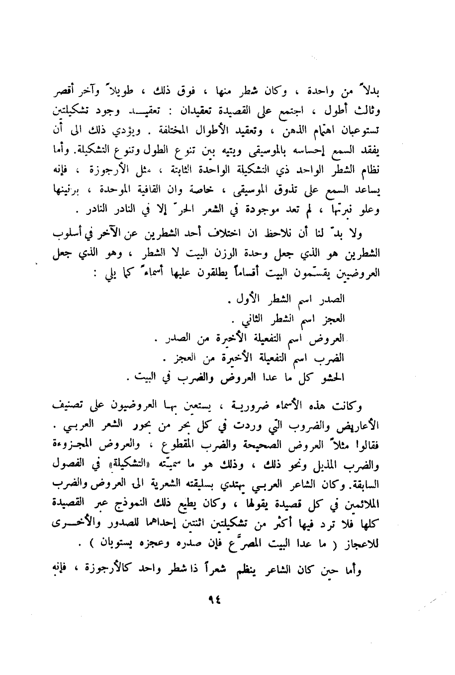وكانت هذه الأسماء ضرورية، يستعين بها العروضيون على تصنيف الأعاريض والضروب التي وردت في كل بحر من بحور الشعر العربي. فقالوا مثلًا العروض الصحيحة والضرب المقطوع، والعروض المجزوءة والضرب المذيل ونحو ذلك، وذلك هو ما سميته "التشكيلة" في الفصول السابقة. وكان الشاعر العربي يهتدي بسليقته الشعرية إلى العروض والضرب الملائمين في كل قصيدة يقولها، وكان يطيع ذلك النموذج عبر القصيدة كلها فلا ترد فيها أكثر من تشكيلتين اثنتين إحداهما للصدور والأخرى للأعجاز "ما عدا البيت المصرع فإن صدره وعجزه يستويان".