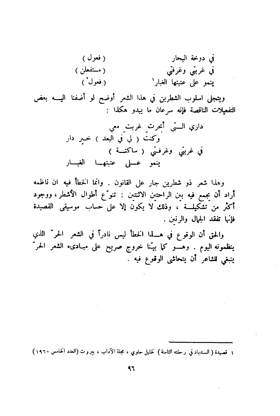 والحق أن الوقوع في هذا الخطإ ليس نادرًا في الشعر الحر الذي ينظمونه اليوم. وهو كما بيَّنَّا خروج صريح على مبادئ الشعر الحر ينبغي للشاعر أن يتحاشى الوقوع فيه.