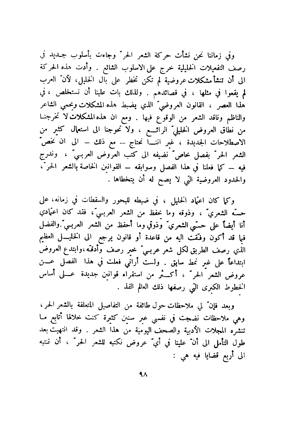 وكما كان اعتماد الخليل، في ضبطه للبحور والسقطات في زمانه على حسه الشعري، وذوقه وما يحفظ من الشعر العربي، فقد كان اعتمادي أنا أيضًا على حس الشعري وذوقي وما أحفظ من الشعر العربي. والفضل فيما قد أكون وفقت إليه من قاعدة أو قانون يرجع إلى الخليل العظيم الذي رصف الطريق لكل شعر عربي خير رصف وأدقه، وابتدع العروض ابتداعًا على غير نمط سابق. ولست أراني فعلت في هذا الفصل عن عروض الشعر الحر، أكثر من استقراء قوانين جديدة على أساس الخطوط الكبرى التي رصفها ذلك العالم الفذ.
