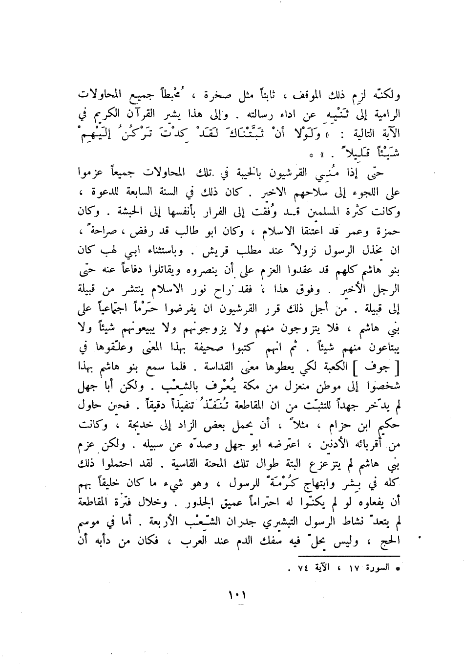 حتى إذا مني القرشيون بالخيبة في تلك المحاولات جميعا عزموا على اللجوء إلى سلاحهم الاخير. كان ذلك في السنة السابعة للدعوة، وكانت كثرة المسلمين قد وفقت إلى الفرار بأنفسها إلى الحبشة. وكان حمزة وعمر قد اعتنقا الاسلام، وكان ابو طالب قد رفض، صراحة، ان يخذل الرسول نزولا عند مطلب قريش. وباستثناء ابي لهب كان بنو هاشم كلهم قد عقدوا العزم على أن ينصروه ويقاتلوا دفاعا عنه حتى الرجل الأخير. وفوق هذا، فقد راح نور الاسلام ينتشر من قبيلة إلى قبيلة. من أجل ذلك قرر القرشيون ان يفرضوا حرما اجتماعيا على بني هاشم، فلا يتزوجون منهم ولا يزوجونهم ولا يبيعونهم شيئا ولا يبتاعون منهم شيئا. ثم انهم كتبوا صحيفة بهذا المعنى وعلّقوها في [جوف] الكعبة لكي يعطوها معنى القداسة. فلما سمع بنو هاشم بهذا شخصوا إلى موطن منعزل من مكة يعرف بالشعب. ولكن أبا جهل لم يدّخر جهدا للتثبّت من ان المقاطعة تنفّذ تنفيذا دقيقا. فحين حاول حكيم ابن حزام، مثلا، أن يحمل بعض الزاد إلى خديجة، وكانت من أقربائه الأدنين، اعترضاه ابو جهل وصدّه عن سبيله. ولكن عزم بني هاشم لم يتزعزع البتة طوال تلك المحنة القاسية. لقد احتملوا ذلك كله في بشر وابتهاج كرمة للرسول، وهو شيء ما كان خليقا بهم أن يفعلوه لو لم يكنّوا له احتراما عميق الجذور. وخلال فترة المقاطعة لم يتعدّ نشاط الرسول التبشيري جدران الشّعب الأربعة. أما في موسم الحج، وليس يحلّ فيه سفك الدم عند العرب، فكان من دأبه أن