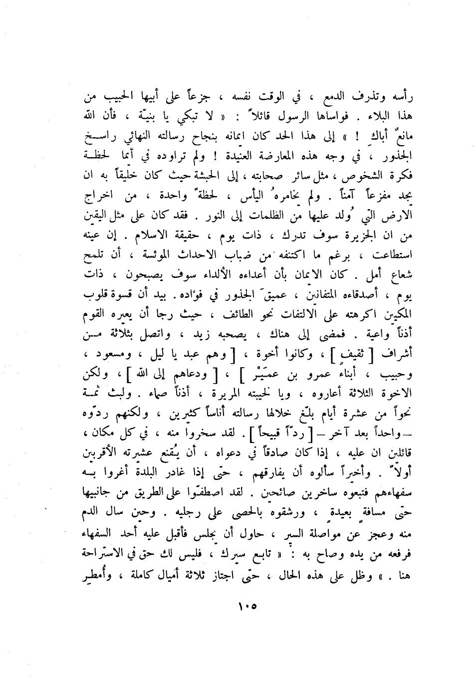 رأسه وتذرف الدمع، في الوقت نفسه، جزعا على أبيها الحبيب من هذا البلاء. فواساها الرسول قائلا: «لا تبكي يا بنيّة، فأن الله مانع أباك!» إلى هذا الحد كان ايمانه بنجاح رسالته النهائي راسخ الجذور، في وجه هذه المعارضة العنيدة! ولم تراوده في أيما لحظة فكرة الشخوص، مثل سائر صحابته، إلى الحبشة حيث كان خليقا به ان يجد مفزعا آمنا. ولم يخامره اليأس، لحظة واحدة، من اخراج الارض التي ولد عليها من الظلمات إلى النور. فقد كان على مثل اليقين من ان الجزيرة سوف تدرك، ذات يوم، حقيقة الاسلام، إن عينه استطاعت، برغم ما اكتنفه من ضباب الاحداث الموئسة، أن تلمح شعاع أمل. كان الايمان بأن أعداءه الألداء سوف يصبحون، ذات يوم، أصدقاءه المتفانين، عميق الجذور في فؤاده. بيد أن قسوة قلوب المكيين اكرهته على الالتفات نحو الطائف، حيث رجا أن يعيره القوم أذنا واعية. فمضى إلى هناك، يصحبه زيد، واتصل بثلاثة من أشراف [ثقيف] ، وكانوا أخوة، [وهم عبد يا ليل، ومسعود، وحبيب، أبناء عمرو بن عمير] ، [ودعاهم إلى الله] ، ولكن الاخوة الثلاثة أعاروه، ويا لخيبته المريرة، أذنا صماء. ولبث ثمة نحوا من عشرة أيام بلّغ خلالها رسالته أناسا كثيرين، ولكنهم ردّوه- واحدا بعد آخر-[ردّا قبيحا] . لقد سخروا منه، في كل مكان، قائلين ان عليه، إذا كان صادقا في دعواه، أن يقنع عشيرته الأقربين أولا. وأخيرا سألوه أن يفارقهم، حتى إذا غادر البلدة أغروا به سفهاءهم فتبعوه ساخرين صائحين. لقد اصطفّوا على الطريق من جانبيها حتى مسافة بعيدة، ورشقوه بالحصى على رجليه. وحين سال الدم منه وعجز عن مواصلة السير، حاول أن يجلس فأقبل عليه أحد السفهاء فرفعه من يده وصاح به: «تابع سيرك، فليس لك حق في الاستراحة هنا.» وظل على هذه الحال، حتى اجتاز ثلاثة أميال كاملة، وأمطر
