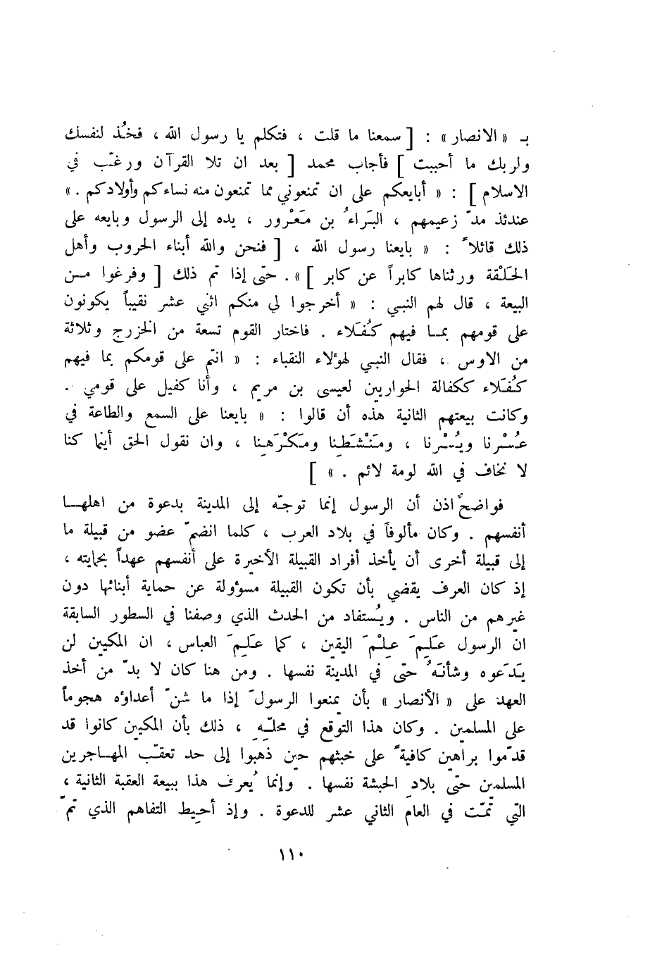 فواضح اذن أن الرسول إنما توجّه إلى المدينة بدعوة من اهلها أنفسهم. وكان مألوفا في بلاد العرب، كلما انضمّ عضو من قبيلة ما إلى قبيلة أخرى أن يأخذ أفراد القبيلة الأخيرة على أنفسهم عهدا بحمايته، إذ كان العرف يقضي بأن تكون القبيلة مسؤولة عن حماية أبنائها دون غيرهم من الناس. ويستفاد من الحدث الذي وصفنا في السطور السابقة ان الرسول علم علم اليقين، كما علم العباس، ان المكيين لن يدعوه وشأنه حتى في المدينة نفسها. ومن هنا كان لا بدّ من أخذ العهد على «الأنصار» بأن يمنعوا الرسول إذا ما شنّ أعداؤه هجوما على المسلمين. وكان هذا التوقع في محلّه، ذلك بأن المكيين كانوا قد قدّموا براهين كافية على خبثهم حين ذهبوا إلى حد تعقّب المهاجرين المسلمين حتى بلاد الحبشة نفسها. وإنما يعرف هذا ببيعة العقبة الثانية، التي تمّت في العام الثاني عشر للدعوة. وإذ أحيط التفاهم الذي تمّ