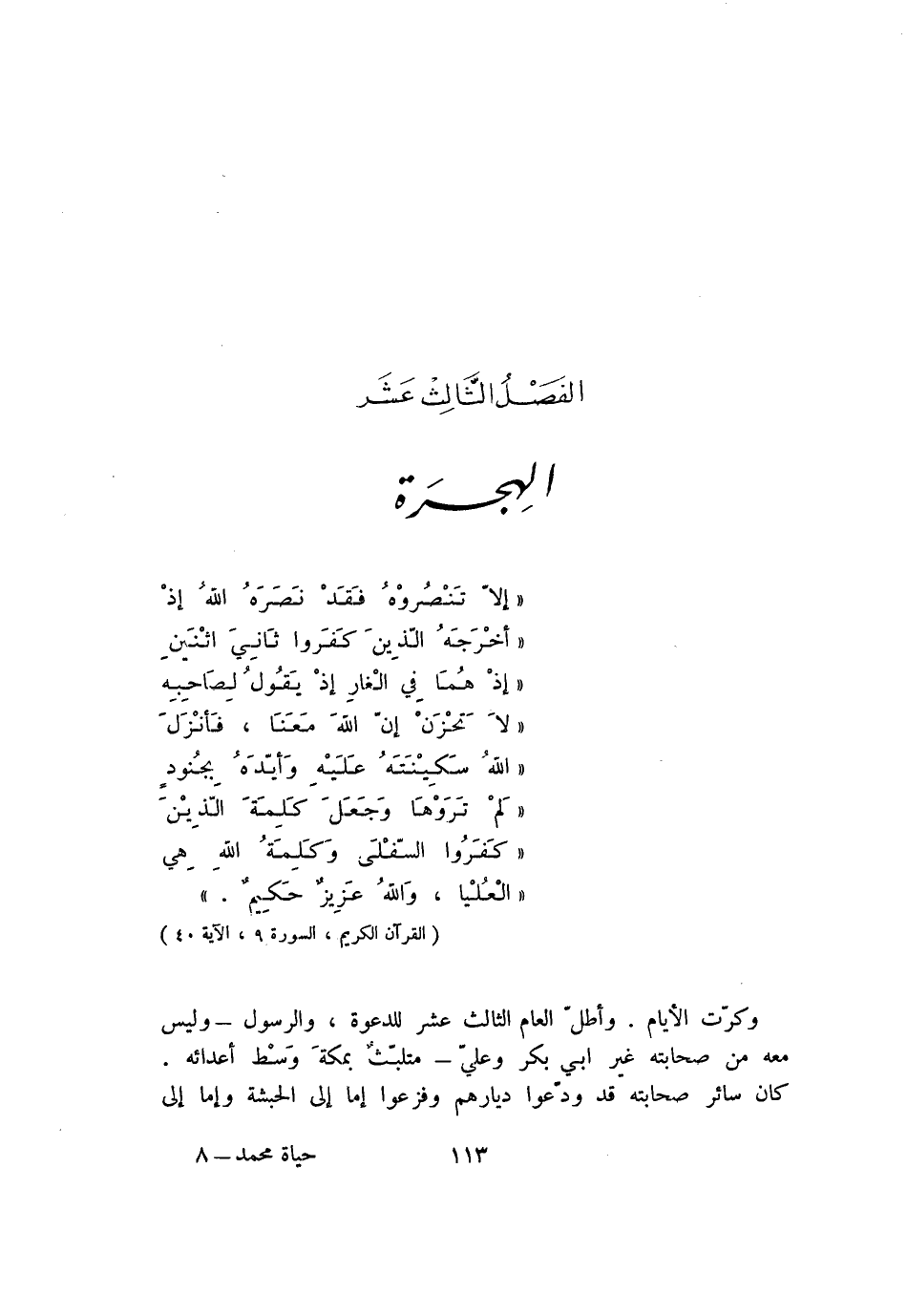 «إِلَّا تَنْصُرُوهُ فَقَدْ نَصَرَهُ اللَّهُ إِذْ «أَخْرَجَهُ الَّذِينَ كَفَرُوا ثانِيَ اثْنَيْنِ «إِذْ هُما فِي الْغارِ إِذْ يَقُولُ لِصاحِبِهِ «لا تَحْزَنْ إِنَّ اللَّهَ مَعَنا، فَأَنْزَلَ «اللَّهُ سَكِينَتَهُ عَلَيْهِ وَأَيَّدَهُ بِجُنُودٍ «لَمْ تَرَوْها وَجَعَلَ كَلِمَةَ الَّذِينَ «كَفَرُوا السُّفْلى وَكَلِمَةُ اللَّهِ هِيَ «الْعُلْيا، وَاللَّهُ عَزِيزٌ حَكِيمٌ.»