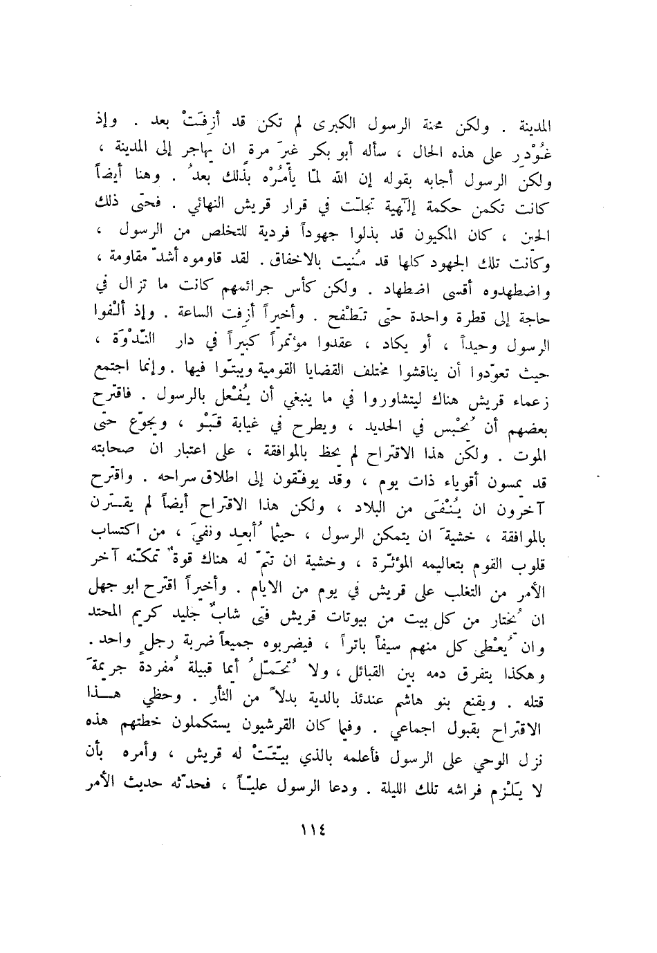 المدينة. ولكن محنة الرسول الكبرى لم تكن قد أزفت بعد. وإذ غودر على هذه الحال، سأله أبو بكر غير مرة ان يهاجر إلى المدينة، ولكن الرسول أجابه بقوله إن الله لمّا يأمره بذلك بعد. وهنا أيضا كانت تكمن حكمة إلهية تجلّت في قرار قريش النهائي. فحتى ذلك الحين، كان المكيون قد بذلوا جهودا فردية للتخلص من الرسول، وكانت تلك الجهود كلها قد منيت بالاخفاق. لقد قاوموه أشدّ مقاومة، واضطهدوه أقسى اضطهاد. ولكن كأس جرائمهم كانت ما تزال في حاجة إلى قطرة واحدة حتى تطفح. وأخيرا أزفت الساعة. وإذ ألفوا الرسول وحيدا، أو يكاد، عقدوا مؤتمرا كبيرا في دار النّدوة، حيث تعوّدوا أن يناقشوا مختلف القضايا القومية ويبتّوا فيها. وإنما اجتمع زعماء قريش هناك ليتشاوروا في ما ينبغي أن يفعل بالرسول. فاقترح بعضهم أن يحبس في الحديد، ويطرح في غيابة قبو، ويجوّع حتى الموت. ولكن هذا الاقتراح لم يحظ بالموافقة، على اعتبار ان صحابته قد يمسون أقوياء ذات يوم، وقد يوفّقون إلى اطلاق سراحه. واقترح آخرون ان ينفى من البلاد، ولكن هذا الاقتراح أيضا لم يقترن بالموافقة، خشية ان يتمكن الرسول، حيثما أبعد ونفي، من اكتساب قلوب القوم بتعاليمه المؤثّرة، وخشية ان تتمّ له هناك قوة تمكّنه آخر الأمر من التغلب على قريش في يوم من الايام. وأخيرا اقترح ابو جهل ان يختار من كل بيت من بيوتات قريش فتى شاب جليد كريم المحتد وان يعطى كل منهم سيفا باترا، فيضربوه جميعا ضربة رجل واحد.