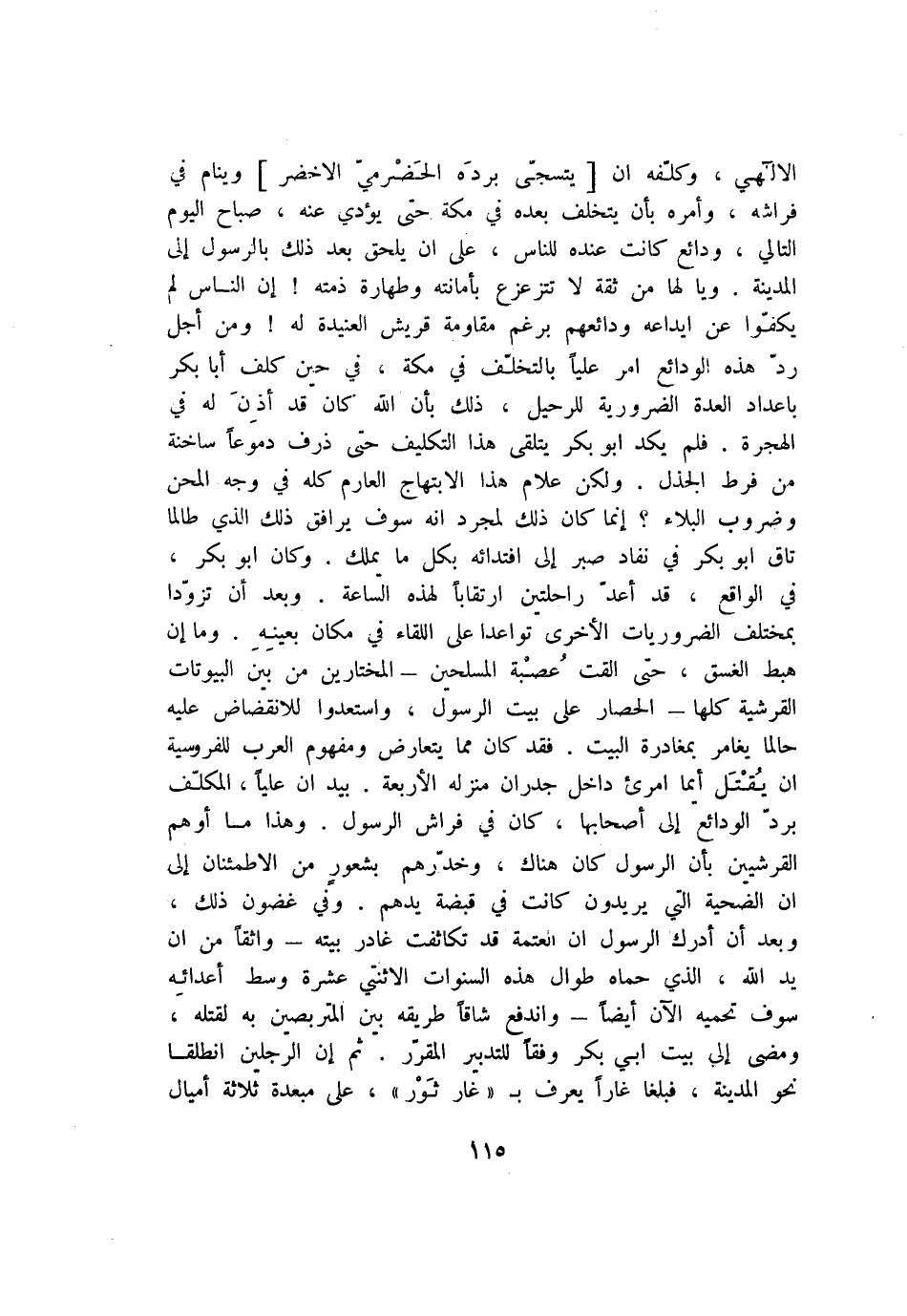 الالهي، وكلّفه ان [يتسجّى برده الحضرميّ الاخضر] وينام في فراشه، وأمره بأن يتخلف بعده في مكة حتى يؤدي عنه، صباح اليوم التالي، ودائع كانت عنده للناس، على أن يلحق بعد ذلك بالرسول إلى المدينة. ويا لها من ثقة لا تتزعزع بأمانته وطهارة ذمته! إن الناس لم يكفّوا عن ايداعه ودائعهم برغم مقاومة قريش العنيدة له! ومن أجل ردّ هذه الودائع امر عليا بالتخلّف في مكة، في حين كلف أبا بكر باعداد العدة الضرورية للرحيل، ذلك بأن الله كان قد أذن له في الهجرة. فلم يكد ابو بكر يتلقى هذا التكليف حتى ذرف دموعا ساخنة من فرط الجذل. ولكن علام هذا الابتهاج العارم كله في وجه المحن وضروب البلاء؟ إنما كان ذلك لمجرد انه سوف يرافق ذلك الذي طالما تاق ابو بكر في نفاد صبر إلى افتدائه بكل ما يملك. وكان ابو بكر، في الواقع، قد أعدّ راحلتين ارتقابا لهذه الساعة. وبعد أن تزوّدا بمختلف الضروريات الأخرى تواعدا على اللقاء في مكان بعينه. وما إن هبط الغسق، حتى القت عصبة المسلحين- المختارين من بين البيوتات القرشية كلها- الحصار على بيت الرسول، واستعدوا للانقضاض عليه حالما يغامر بمغادرة البيت. فقد كان مما يتعارض ومفهوم العرب للفروسية ان يقتل أيما امرئ داخل جدران منزله الأربعة. بيد ان عليا، المكلّف بردّ الودائع إلى أصحابها، كان في فراش الرسول. وهذا ما أوهم القرشيين بأن الرسول كان هناك، وخدّرهم بشعور من الاطمئنان إلى ان الضحية التي يريدون كانت في قبضة يدهم. وفي غضون ذلك، وبعد أن أدرك الرسول ان العتمة قد تكاثفت غادر بيته- واثقا من ان يد الله، الذي حماه طوال هذه السنوات الاثنتي عشرة وسط أعدائه سوف تحميه الآن أيضا- واندفع شاقا طريقه بين المتربصين به لقتله، ومضى إلى بيت ابي بكر وفقا للتدبير المقرّر. ثم إن الرجلين انطلقا نحو المدينة، فبلغا غارا يعرف ب «غار ثور» ، على مبعدة ثلاثة أميال