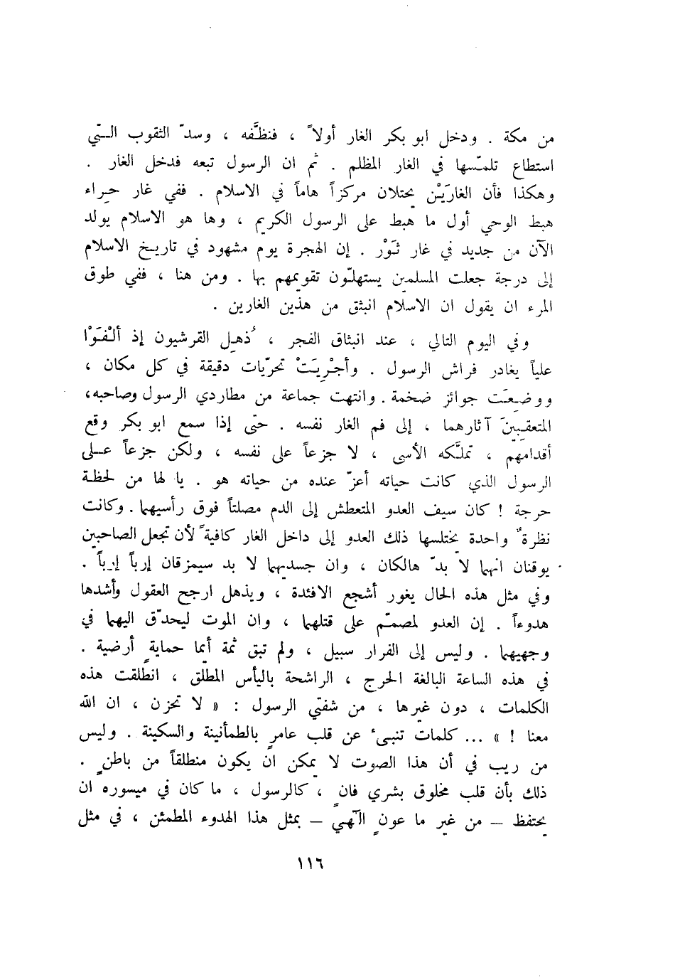 في هذه الساعة البالغة الحرج، الراشحة باليأس المطلق، انطلقت هذه الكلمات، دون غيرها، من شفتي الرسول: «لا تحزن، ان الله معنا!» ... كلمات تنبئ عن قلب عامر بالطمأنينة والسكينة. وليس من ريب في أن هذا الصوت لا يمكن أن يكون منطلقا من باطن.