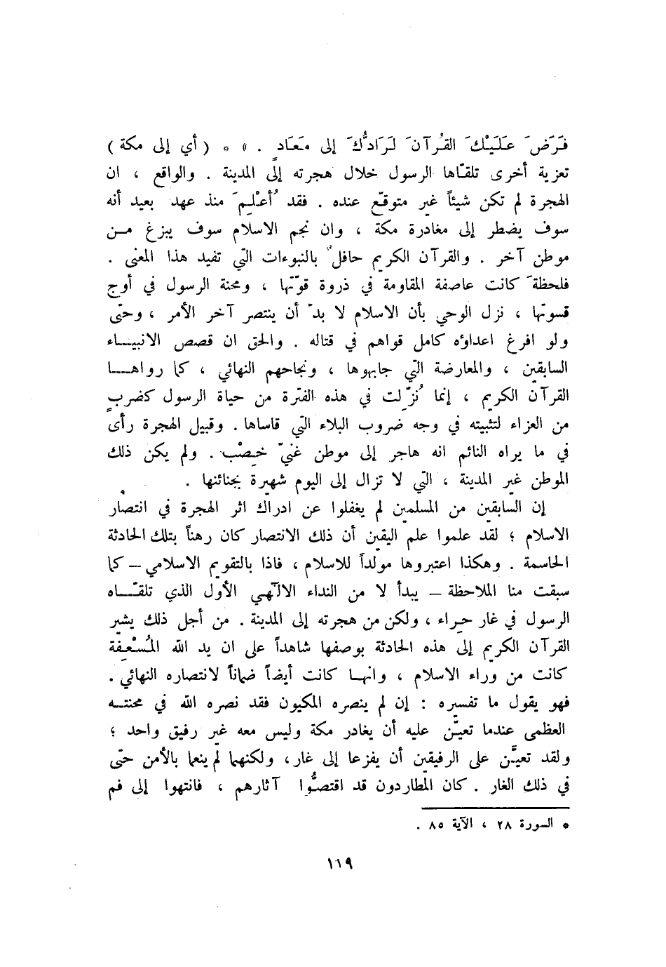 فَرَضَ عَلَيْكَ الْقُرْآنَ لَرادُّكَ إِلى مَعادٍ.» * (أي إلى مكة) تعزية أخرى تلقّاها الرسول خلال هجرته إلى المدينة. والواقع، ان الهجرة لم تكن شيئا غير متوقّع عنده. فقد أعلم منذ عهد بعيد أنه سوف يضطر إلى مغادرة مكة، وان نجم الاسلام سوف يبزغ من موطن آخر. والقرآن الكريم حافل بالنبوآت التي تفيد هذا المعنى.