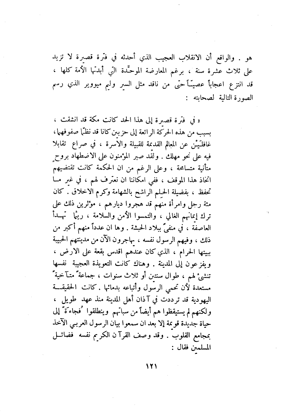 «في فترة قصيرة إلى هذا الحد كانت مكة قد انشقت، بسبب من هذه الحركة الرائعة إلى حزبين كانا قد نظّما صفوفهما، غافلين عن المعالم القديمة للقبيلة والاسرة، في صراع تقابلا فيه على نحو مهلك. ولقد صبر المؤمنون على الاضطهاد بروح متأنية متسامحة، وعلى الرغم من ان الحكمة كانت تقتضيهم اتخاذ هذا الموقف، ففي امكاننا ان نعترف لهم، في غير ما تحفظ، بفضيلة الحلم الراشح بالشهامة وكرم الاخلاق. كان مئة رجل وامرأة منهم قد هجروا ديارهم، مؤثرين ذلك على ترك إيمانهم الغالي، والتمسوا الأمن والسلامة، ريثما تهدأ العاصفة، في منفى ببلاد الحبشة. وها ان عددا منهم أكبر من ذلك، وفيهم الرسول نفسه، يهاجرون الآن من مدينتهم الحبيبة ببيتها الحرام، الذي كان عندهم اقدس بقعة على الارض، ويفزعون إلى المدينة. وهناك كانت التعويذة العجيبة نفسها تنشئ لهم، طوال سنتين أو ثلاث سنوات، جماعة متآخية مستعدة لأن تحمي الرسول وأتباعه بدمائها. كانت الحقيقة اليهودية قد ترددت في آذان أهل المدينة منذ عهد طويل، ولكنهم لم يستيقظوا هم أيضا من سباتهم وينطلقوا فجاءة إلى حياة جديدة قويمة إلا بعد ان سمعوا بيان الرسول العربي الآخذ بمجامع القلوب. وقد وصف القرآن الكريم نفسه فضائل المسلمين فقال: