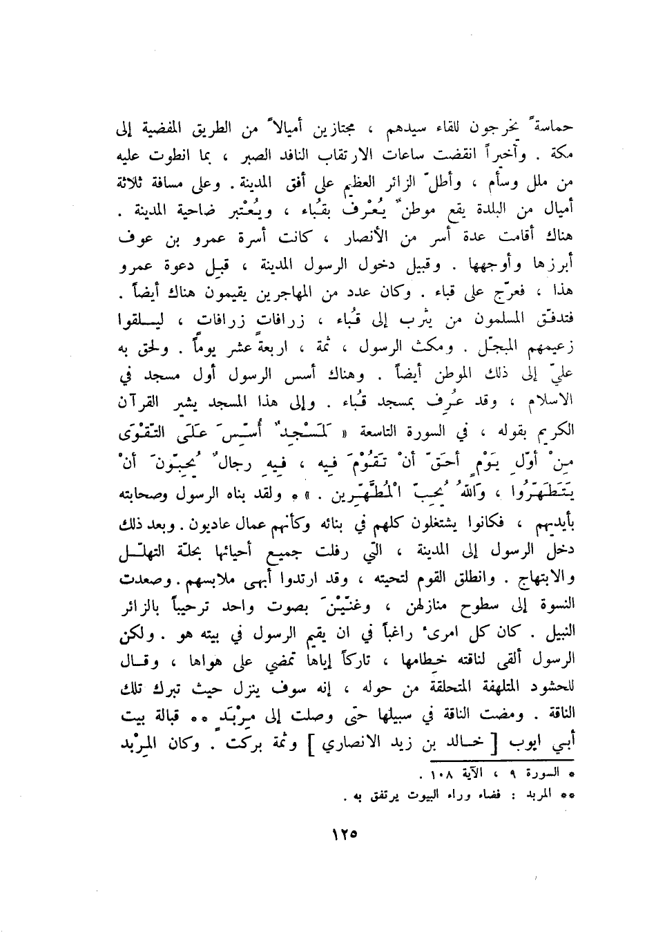 فتدفّق المسلمون من يثرب إلى قباء، زرافات زرافات، ليلقوا زعيمهم المبجّل. ومكث الرسول، ثمة، اربعة عشر يوما. ولحق به عليّ إلى ذلك الموطن أيضا. وهناك أسس الرسول أول مسجد في الاسلام، وقد عرف بمسجد قباء. وإلى هذا المسجد يشير القرآن الكريم بقوله، في السورة التاسعة «لَمَسْجِدٌ أُسِّسَ عَلَى التَّقْوى مِنْ أَوَّلِ يَوْمٍ أَحَقُّ أَنْ تَقُومَ فِيهِ، فِيهِ رِجالٌ يُحِبُّونَ أَنْ يَتَطَهَّرُوا، وَاللَّهُ يُحِبُّ الْمُطَّهِّرِينَ.» * ولقد بناه الرسول وصحابته بأيديهم، فكانوا يشتغلون كلهم في بنائه وكأنهم عمال عاديون. وبعد ذلك دخل الرسول إلى المدينة، التي رفلت جميع أحيائها بحلّة التهلّل والابتهاج. وانطلق القوم لتحيته، وقد ارتدوا أبهى ملابسهم. وصعدت النسوة إلى سطوح منازلهن، وغنّين بصوت واحد ترحيبا بالزائر النبيل. كان كل امرئ راغبا في ان يقيم الرسول في بيته هو. ولكن الرسول ألقى لناقته خطامها، تاركا إياها تمضي على هواها، وقال للحشود المتلهفة المتحلقة من حوله، إنه سوف ينزل حيث تبرك تلك الناقة. ومضت الناقة في سبيلها حتى وصلت إلى مربد** قبالة بيت أبي أيوب [خالد بن زيد الأنصاري] وثمة بركت. وكان المربد