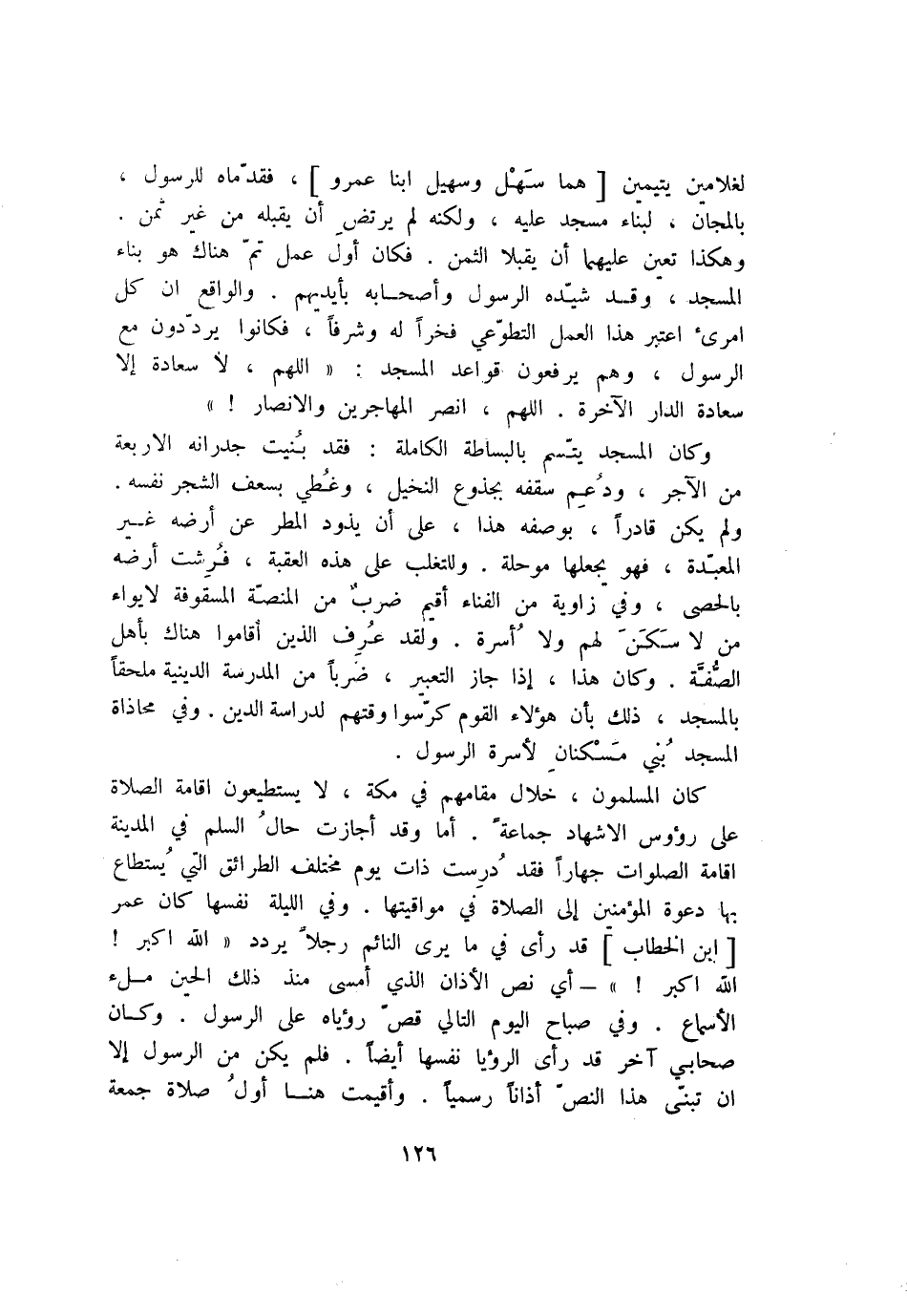 وهكذا تعين عليهما أن يقبلا الثمن. فكان أول عمل تمّ هناك هو بناء المسجد، وقد شيّده الرسول وأصحابه بأيديهم. والواقع ان كل امرئ اعتبر هذا العمل التطوّعي فخرا له وشرفا، فكانوا يردّدون مع الرسول، وهم يرفعون قواعد المسجد: «اللهم، لا سعادة إلا سعادة الدار الآخرة. اللهم، انصر المهاجرين والانصار!»