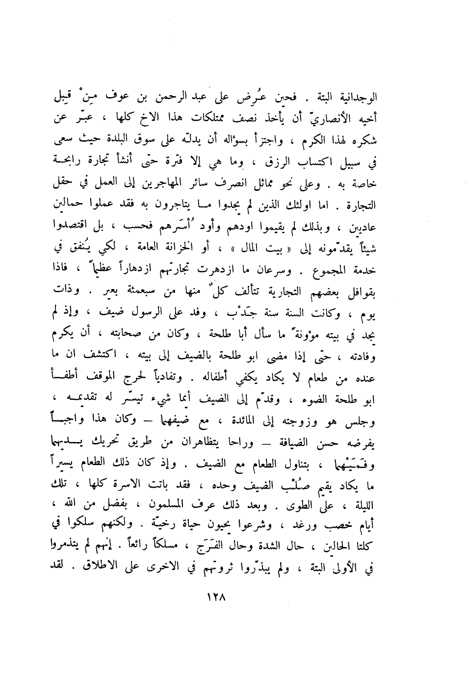الوجدانية البتة. فحين عرض على عبد الرحمن بن عوف من قبل أخيه الأنصاريّ أن يأخذ نصف ممتلكات هذا الاخ كلها، عبّر عن شكره لهذا الكرم، واجتزأ بسؤاله أن يدلّه على سوق البلدة حيث سعى في سبيل اكتساب الرزق، وما هي إلا فترة حتى أنشأ تجارة رابحة خاصة به. وعلى نحو مماثل انصرف سائر المهاجرين إلى العمل في حقل التجارة. اما اولئك الذين لم يجدوا ما يتاجرون به فقد عملوا حمالين عاديين، وبذلك لم يقيموا اودهم وأود أسرهم فحسب، بل اقتصدوا شيئا يقدّمونه إلى «بيت المال» ، أو الخزانة العامة، لكي ينفق في خدمة المجموع. وسرعان ما ازدهرت تجارتهم ازدهارا عظيما، فاذا بقوافل بعضهم التجارية تتألف كل منها من سبعمئة بعير. وذات يوم، وكانت السنة سنة جدب، وفد على الرسول ضيف، وإذ لم يجد في بيته مؤونة ما سأل أبا طلحة، وكان من صحابته، أن يكرم وفادته، حتى إذا مضى ابو طلحة بالضيف إلى بيته، اكتشف ان ما عنده من طعام لا يكاد يكفي أطفاله. وتفاديا لحرج الموقف أطفأ ابو طلحة الضوء، وقدّم إلى الضيف أيما شيء تيسّر له تقديمه، وجلس هو وزوجته إلى المائدة، مع ضيفهما- وكان هذا واجبا يفرضه حسن الضيافة- رواحا يتظاهران من طريق تحريك يديهما وفميهما، بتناول الطعام مع الضيف. وإذ كان ذلك الطعام يسيرا ما يكاد يقيم صلب الضيف وحده، فقد باتت الاسرة كلها، تلك الليلة، على الطوى. وبعد ذلك عرف المسلمون، بفضل من الله، أيام خصب ورغد، وشرعوا يحيون حياة رخيّة. ولكنهم سلكوا في كلتا الحالين، حال الشدة وحال الفرج، مسلكا رائعا. إنهم لم يتذمروا في الأولى البتة، ولم يبذّروا ثروتهم في الاخرى على الاطلاق. لقد