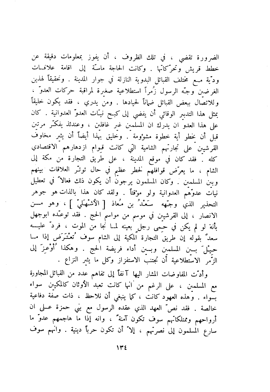 وللاتصال ببعض القبائل ضمانا لحيادها. ومن يدري، فقد يكون خليقا بمثل هذا التدبير الوقائي أن يفضي إلى كبح نيّات العدوّ العدوانية. كان على هذا العدو ان يدرك ان المسلمين غير غافلين، وعندئذ يفكّر مرتين قبل أن يخطو أية خطوة مشؤومة. وخليق بهذا أيضا أن يثير مخاوف القرشيين على تجارتهم الشامية التي كانت قوام ازدهارهم الاقتصادي كله. فقد كان في موقع المدينة، على طريق التجارة من مكة إلى الشام، ما يعرّض قوافلهم لخطر عظيم في حال توتّر العلاقات بينهم وبين المسلمين. وكان المسلمون يرجون أن يكون ذلك فعالا في تعطيل نيات عدوّهم العدوانية ولو مؤقتا. ولقد كان هذا بالذات هو جوهر التحذير الذي وجّهه سعد بن معاذ [الأشهليّ] ، وهو من الانصار، إلى القرشيين في موسم من مواسم الحج. فقد توعّده ابو جهل بأنه لو لم يكن في حمى رجل بعينه لما نجا من الموت، فردّ عليه سعد بقوله إن طريق التجارة المكية إلى الشام سوف تعترض إذا ما حيل بين المسلمين وبين أداء فريضة الحج. وهكذا أوعز إلى الزّمر الاستطلاعية أن تجتنب الاستفزاز وكل ما يثير النزاع.