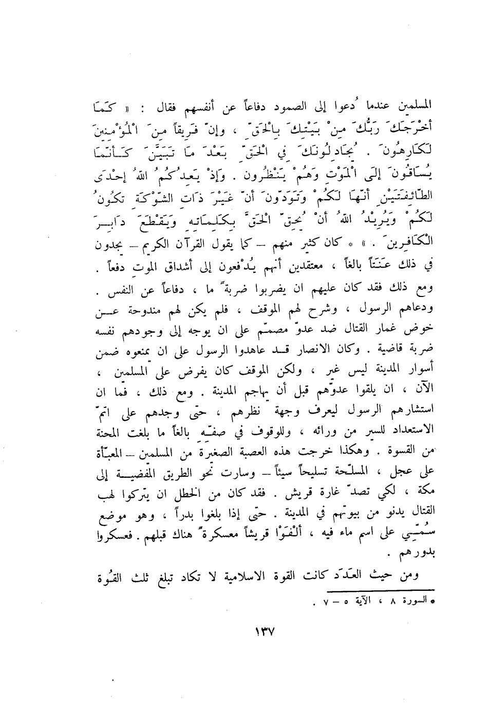 المسلمين عندما دعوا إلى الصمود دفاعا عن أنفسهم فقال: «كَما أَخْرَجَكَ رَبُّكَ مِنْ بَيْتِكَ بِالْحَقِّ، وَإِنَّ فَرِيقاً مِنَ الْمُؤْمِنِينَ لَكارِهُونَ. يُجادِلُونَكَ فِي الْحَقِّ بَعْدَ ما تَبَيَّنَ كَأَنَّما يُساقُونَ إِلَى الْمَوْتِ وَهُمْ يَنْظُرُونَ. وَإِذْ يَعِدُكُمُ اللَّهُ إِحْدَى الطَّائِفَتَيْنِ أَنَّها لَكُمْ وَتَوَدُّونَ أَنَّ غَيْرَ ذاتِ الشَّوْكَةِ تَكُونُ لَكُمْ وَيُرِيدُ اللَّهُ أَنْ يُحِقَّ الْحَقَّ بِكَلِماتِهِ وَيَقْطَعَ دابِرَ الْكافِرِينَ.» * كان كثير منهم- كما يقول القرآن الكريم- يجدون في ذلك عنتا بالغا، معتقدين أنهم يدفعون إلى أشداق الموت دفعا.
