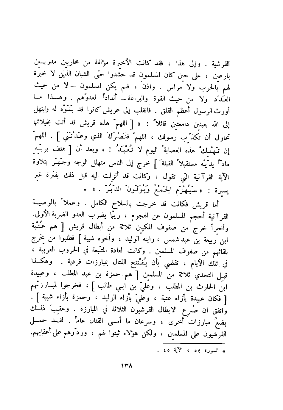 القرشية. وإلى هذا، فقد كانت الأخيرة مؤلفة من محاربين مدربين بارعين، على حين كان المسلمون قد حشدوا حتى الشبان الذين لا خبرة لهم بالحرب ولا مراس. واذن، فلم يكن المسلمون- لا من حيث العدد ولا من حيث القوة والبراعة- أندادا لعدوّهم. وهذا ما أورث الرسول أعظم القلق. فانقلب إلى عريش كانوا قد بنوه له وابتهل إلى الله بعينين دامعتين قائلا: « [اللهمّ هذه قريش قد أتت بخيلائها تحاول أن تكذّب رسولك، اللهمّ فنصرك الذي وعدتني] . اللهم إن تهلك هذه العصابة اليوم لا تعبد!» وبعد أن [هتف بربّه مادّا يديه مستقبلا القبلة] خرج إلى الناس متهلل الوجه وجهر بتلاوة الآية القرآنية التي تقول، وكانت قد أنزلت اليه قبل ذلك بفترة غير يسيرة: «سَيُهْزَمُ الْجَمْعُ وَيُوَلُّونَ الدُّبُرَ.» *