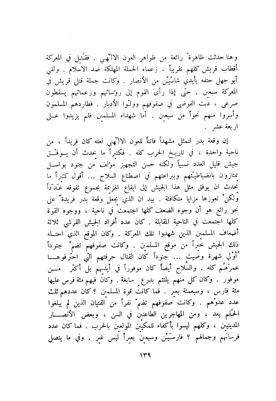 إن وقعة بدر لتمثل مشهدا فاتنا للعون الالهي لعله كان فريدا، من ناحية واحدة، في تاريخ الحرب كله. فكثيرا ما يحدث أن يوفّق جيش قليل العدد نسبيا ولكنه حسن التجهيز مؤلف من جنود بواسل يمتازون بانضباطيّتهم وببراعتهم في اصطناع السلاح ... أقول كثيرا ما يحدث أن يوفق مثل هذا الجيش إلى ايقاع الهزيمة بمجموع تفوقه عددا ولكن تعوزها مزايا متكافئة. بيد ان الذي يجعل وقعة بدر فريدة على نحو رائع هو أن وجوه الضعف كلها اجتمعت في ناحية، ووجوه القوة كلها اجتمعت في الناحية المقابلة. كان عدد أفراد الجيش القرشي ثلاثة أضعاف المسلمين الذين شهدوا تلك المعركة. وكان الموقع الذي احتله ذلك الجيش خيرا من موقع المسلمين. وكانت صفوفهم تضمّ جنودا أولي شهرة وصيت ... جنودا كان القتال حرفتهم التي احترفوها عمرهم كله. والسلاح أيضا كان موفورا في أيديهم بل أكثر من موفور. وكان كل منهم يلتئم بدرع سابغة. وكان فيهم مئة فرس عليها مئة فارس، وسبعمئة بعير. فما كانت قوة المسلمين؟ كان عددهم ثلث عدد عدوّهم. وكانت صفوفهم تضمّ نفرا من الفتيان الذين لم يبلغوا الحلم بعد، ومن المهاجرين الطاعنين في السن، وبعض الأنصار المدينيين، وكلهم ليسوا بأكفاء للمكيين المولعين بالحرب. فما كان عدد فرسانهم وجمالهم؟ فارسين وسبعين بعيرا ليس غير. وفي ما يتصل