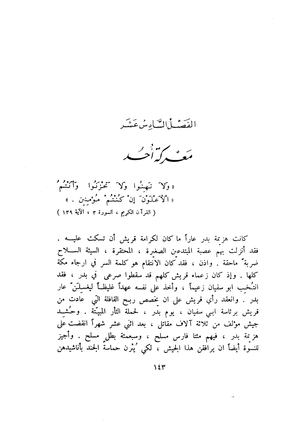 فقد أنزلت بهم عصبة المبتدعين الصغيرة، المحتقرة، السيئة السلاح ضربة ما حقة. واذن، فقد كان الانتقام هو كلمة السر في ارجاء مكة كلها. وإذ كان زعماء قريش كلهم قد سقطوا صرعى في بدر، فقد انتخب ابو سفيان زعيما، وأخذ على نفسه عهدا غليظا ليغسلنّ عار بدر. وانعقد رأي قريش على ان يخصص ربح القافلة التي عادت من قريش برئاسة ابي سفيان، يوم بدر، لحملة الثأر المبيّتة. وحشد جيش مؤلف من ثلاثة آلاف مقاتل، بعد اثني عشر شهرا انقضت على هزيمة بدر، فيهم مئتا فارس مسلح، وسبعمئة بطل مسلح. وأجيز للنسوة أيضا ان يرافقن هذا الجيش، لكي يثرن حماسة الجند بأناشيدهن