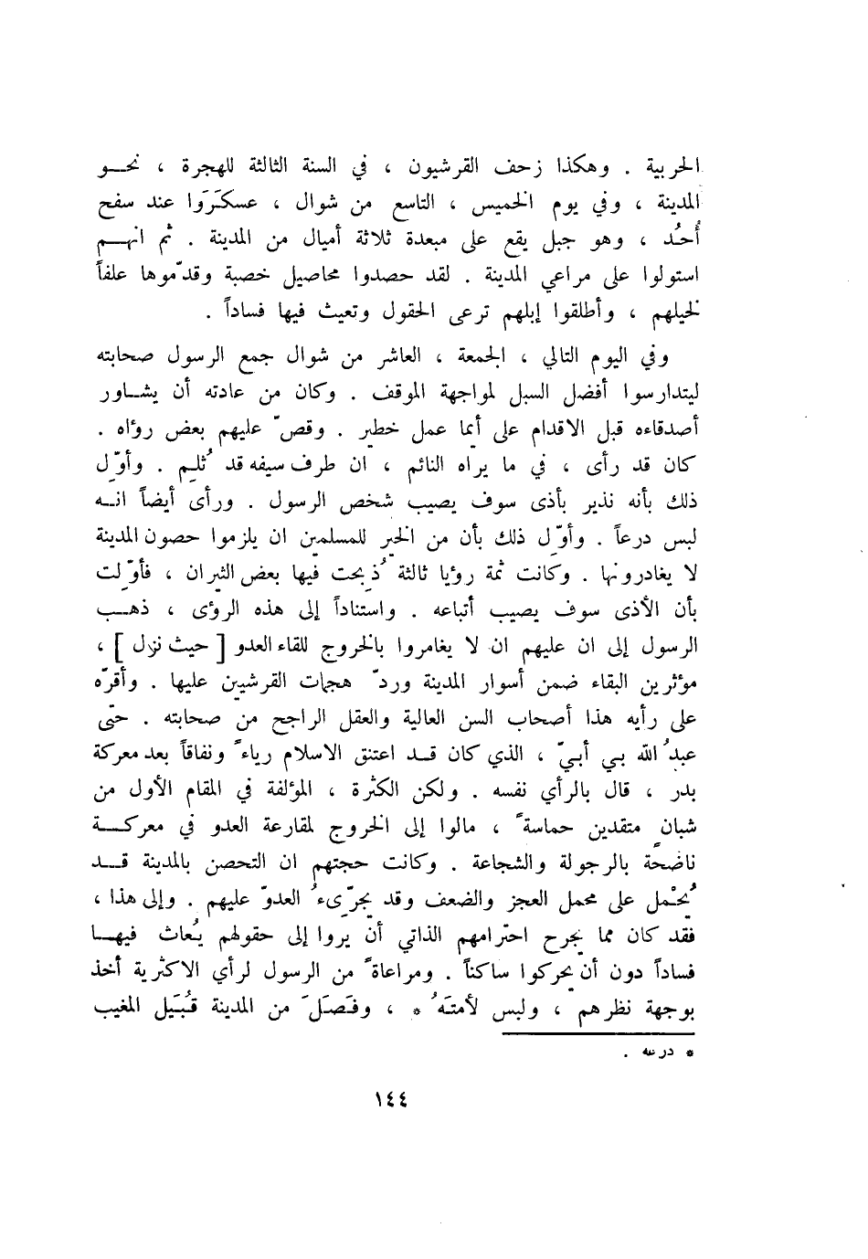 الحربية. وهكذا زحف القرشيون، في السنة الثالثة للهجرة، نحو المدينة، وفي يوم الخميس، التاسع من شوال، عسكروا عند سفح أحد، وهو جبل يقع على مبعدة ثلاثة أميال من المدينة. ثم انهم استولوا على مراعي المدينة. لقد حصدوا محاصيل خصبة وقدّموها علفا لخيلهم، وأطلقوا إبلهم ترعى الحقول وتعيث فيها فسادا.