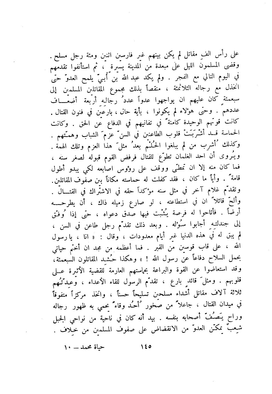 وألحّ قائلا ان في استطاعته، لو صارع زميله ذاك، أن يطرحه أرضا. فأتاحوا له فرصة يثبت فيها صدق دعواه، حتى إذا وفّق إلى جندلته أجابوا سؤله. وبعد ذلك تقدّم رجل طاعن في السن، لم يبق له في هذه الدنيا غير أيام معدودات، وقال: «انا، يا رسول الله، على قاب قوسين من القبر. فما أعظمه من مجد ان أختم حياتي بحمل السلاح دفاعا عن رسول الله!» وهكذا حشد المقاتلون السبعمئة، وقد استعاضوا عن القوة والبراعة بحماستهم العارمة للقضية الأثيرة على قلوبهم. ومثل قائد بارع، تقدّم الرسول للقاء الأعداء، وعدّتهم ثلاثة آلاف مقاتل أشداء مسلحين تسليحا حسنا، واتخذ مركزا متفوقا في ميدان القتال، جاعلا من صخور أحد وقاء يحمي به ظهور رجاله وراح يصفّ أصحابه بنفسه. بيد أنه كان في ناحية من نواحي الجبل شعب يمكّن العدوّ من الانقضاض على صفوف المسلمين من خلاف.