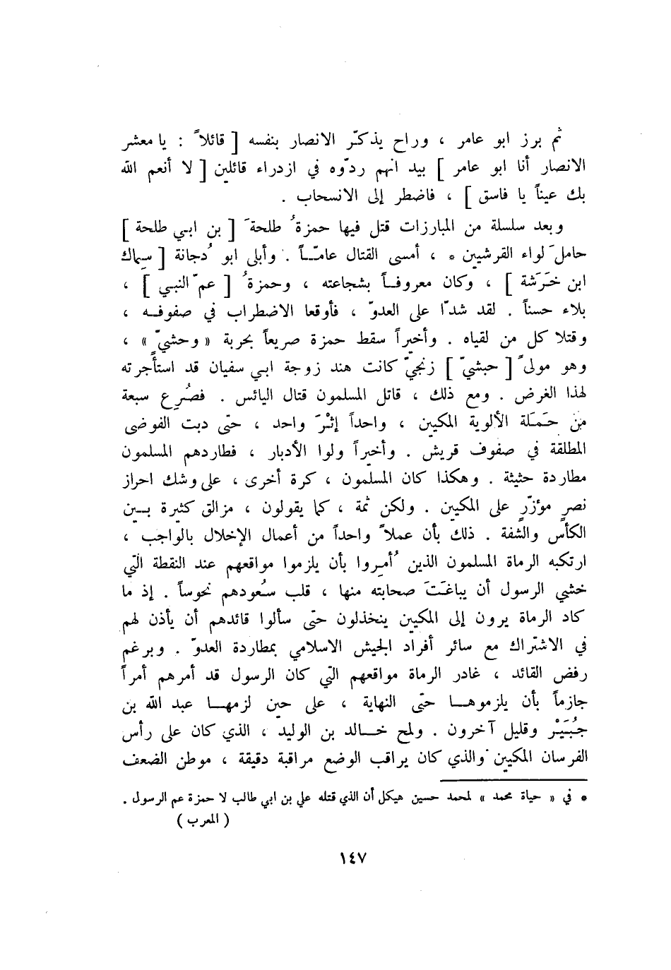 (*) في «حياة محمد» لمحمد حسين هيكل أن الذي قتله علي بن أبي طالب لا حمزة عم الرسول.