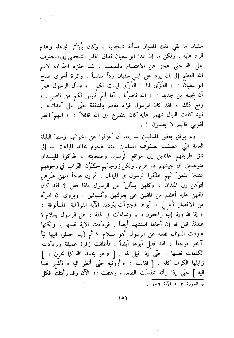 سفيان ما بقي ذلك الهذيان مسألة شخصية، وكان يؤثر تجاهله وعدم الرد عليه. ولكن ما إن عدا ابو سفيان نطاق الهذر الشخصي إلى التجديف على الله حتى عجز عن الاعتصام بالصمت. لقد حفزه احترامه لاسم الله العظيم إلى ان يرد على ابي سفيان ردا مناسبا. وكرة أخرى صاح ابو سفيان: «العزّى لنا! العزّى ليست لكم.» فسأل الرسول عمر أن يجيبه من جديد: «الله ناصرنا. أما أنتم فليس لكم من ناصر.»