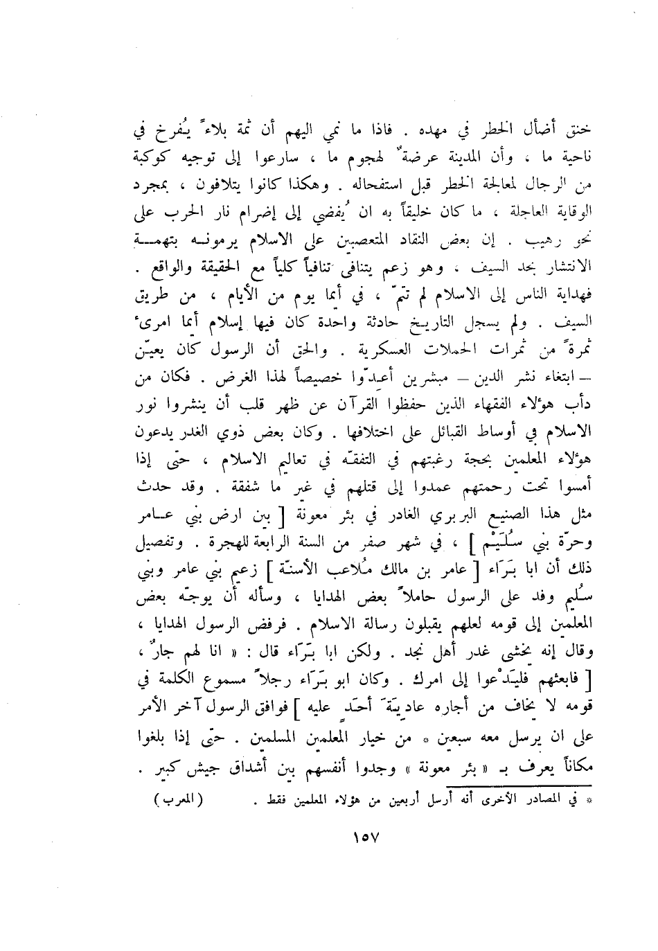 فهداية الناس إلى الاسلام لم تتمّ، في أيما يوم من الأيام، من طريق السيف. ولم يسجل التاريخ حادثة واحدة كان فيها إسلام أيما امرئ ثمرة من ثمرات الحملات العسكرية. والحق أن الرسول كان يعيّن- ابتغاء نشر الدين- مبشرين أعدّوا خصيصا لهذا الغرض. فكان من دأب هؤلاء الفقهاء الذين حفظوا القرآن عن ظهر قلب أن ينشروا نور الاسلام في أوساط القبائل على اختلافها. وكان بعض ذوي الغدر يدعون هؤلاء المعلمين بحجة رغبتهم في التفقّه في تعاليم الاسلام، حتى إذا أمسوا تحت رحمتهم عمدوا إلى قتلهم في غير ما شفقة. وقد حدث مثل هذا الصنيع البربري الغادر في بئر معونة [بين ارض بني عامر وحرّة بني سليم] ، في شهر صفر من السنة الرابعة للهجرة. وتفصيل ذلك أن ابا براء [عامر بن مالك ملاعب الأسنّة] زعيم بني عامر وبني سليم وفد على الرسول حاملا بعض الهدايا، وسأله أن يوجّه بعض المعلمين إلى قومه لعلهم يقبلون رسالة الاسلام. فرفض الرسول الهدايا، وقال إنه يخشى غدر أهل نجد. ولكن ابا براء قال: «انا لهم جار، [فابعثهم فليدعوا إلى امرك. وكان ابو براء رجلا مسموع الكلمة في قومه لا يخاف من أجاره عادية أحد عليه] فوافق الرسول آخر الأمر على ان يرسل معه سبعين* من خيار المعلمين المسلمين. حتى إذا بلغوا مكانا يعرف ب «بئر معونة» وجدوا أنفسهم بين أشداق جيش كبير.
