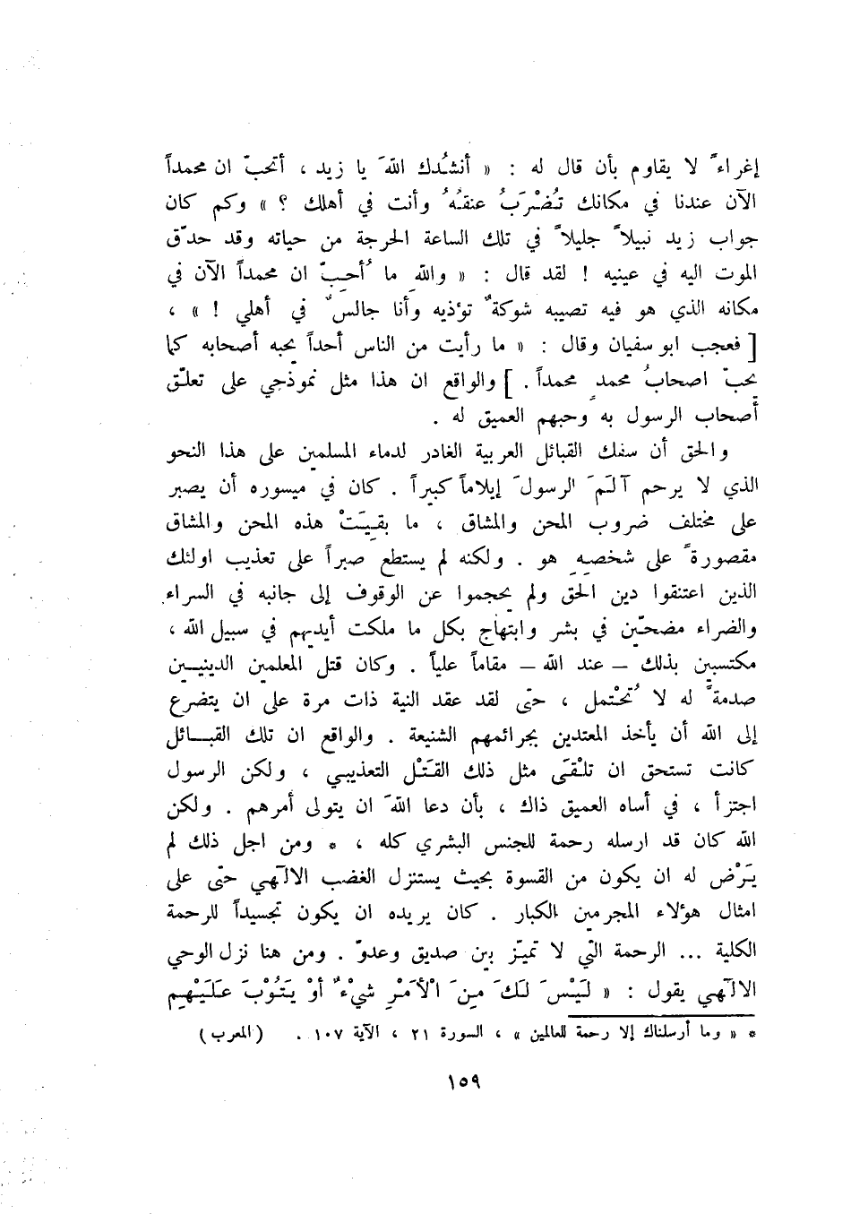 والحق أن سفك القبائل العربية الغادر لدماء المسلمين على هذا النحو الذي لا يرحم آلم الرسول إيلاما كبيرا. كان في ميسوره أن يصبر على مختلف ضروب المحن والمشاق، ما بقيت هذه المحن والمشاق مقصورة على شخصه هو. ولكنه لم يستطع صبرا على تعذيب اولئك الذين اعتنقوا دين الحق ولم يحجموا عن الوقوف إلى جانبه في السراء والضراء مضحّين في بشر وابتهاج بكل ما ملكت أيديهم في سبيل الله، مكتسبين بذلك- عند الله- مقاما عليا. وكان قتل المعلمين الدينيين صدمة له لا تحتمل، حتى لقد عقد النية ذات مرة على ان يتضرع إلى الله أن يأخذ المعتدين بجرائمهم الشنيعة. والواقع ان تلك القبائل كانت تستحق ان تلقى مثل ذلك القتل التعذيبي، ولكن الرسول اجتزأ، في أساه العميق ذاك، بأن دعا الله ان يتولى أمرهم. ولكن الله كان قد ارسله رحمة للجنس البشري كله، * ومن اجل ذلك لم يرض له ان يكون من القسوة بحيث يستنزل الغضب الالهي حتى على امثال هؤلاء المجرمين الكبار. كان يريده ان يكون تجسيدا للرحمة الكلية ... الرحمة التي لا تميّز بين صديق وعدوّ. ومن هنا نزل الوحي الالهي يقول: «لَيْسَ لَكَ مِنَ الْأَمْرِ شَيْءٌ أَوْ يَتُوبَ عَلَيْهِمْ