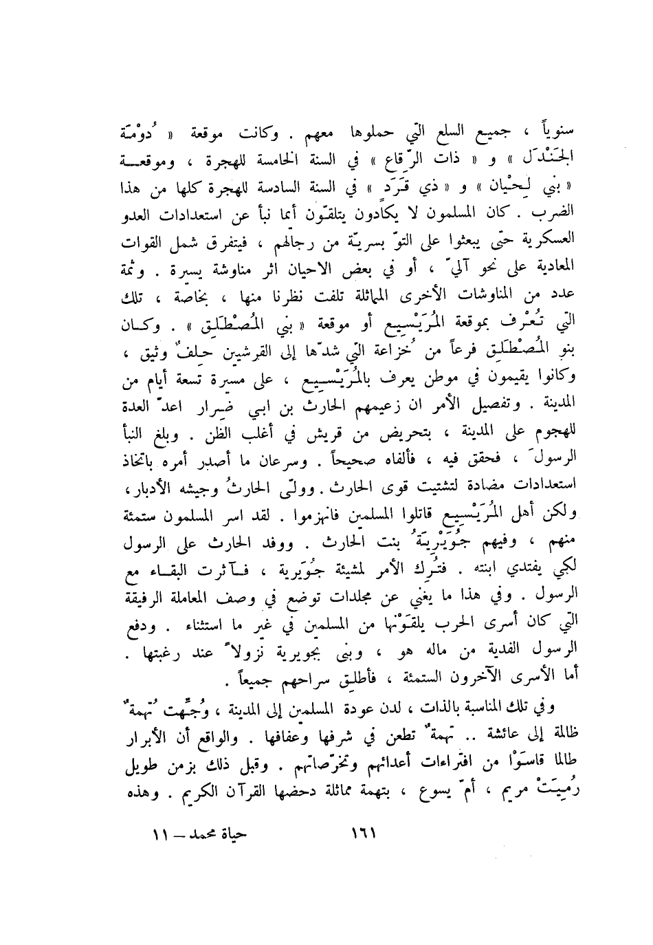 سنويا، جميع السلع التي حملوها معهم. وكانت موقعة «دومة الجندل» و «ذات الرّقاع» في السنة الخامسة للهجرة، وموقعة «بني لحيان» و «ذي قرد» في السنة السادسة للهجرة كلها من هذا الضرب. كان المسلمون لا يكادون يتلقّون أيما نبأ عن استعدادات العدو العسكرية حتى يبعثوا على التوّ بسريّة من رجالهم، فيتفرق شمل القوات المعادية على نحو آليّ، أو في بعض الاحيان اثر مناوشة يسيرة. وثمة عدد من المناوشات الأخرى المماثلة تلفت نظرنا منها، بخاصة، تلك التي تعرف بموقعة المريسيع أو موقعة «بني المصطلق» . وكان بنو المصطلق فرعا من خزاعة التي شدّها إلى القرشيين حلف وثيق، وكانوا يقيمون في موطن يعرف بالمريسيع، على مسيرة تسعة أيام من المدينة. وتفصيل الأمر ان زعيمهم الحارث بن ابي ضرار اعدّ العدة للهجوم على المدينة، بتحريض من قريش في أغلب الظن. وبلغ النبأ الرسول، فحقق فيه، فألفاه صحيحا. وسرعان ما أصدر أمره باتخاذ استعدادات مضادة لتشتيت قوى الحارث. وولىّ الحارث وجيشه الأدبار، ولكن أهل المريسيع قاتلوا المسلمين فانهزموا. لقد اسر المسلمون ستمئة منهم، وفيهم جويرية بنت الحارث. ووفد الحارث على الرسول لكي يفتدي ابنته. فترك الأمر لمشيئة جويرية، فآثرت البقاء مع الرسول. وفي هذا ما يغني عن مجلدات توضع في وصف المعاملة الرفيقة التي كان أسرى الحرب يلقونها من المسلمين في غير ما استثناء. ودفع الرسول الفدية من ماله هو، وبني بجويرية نزولا عند رغبتها.