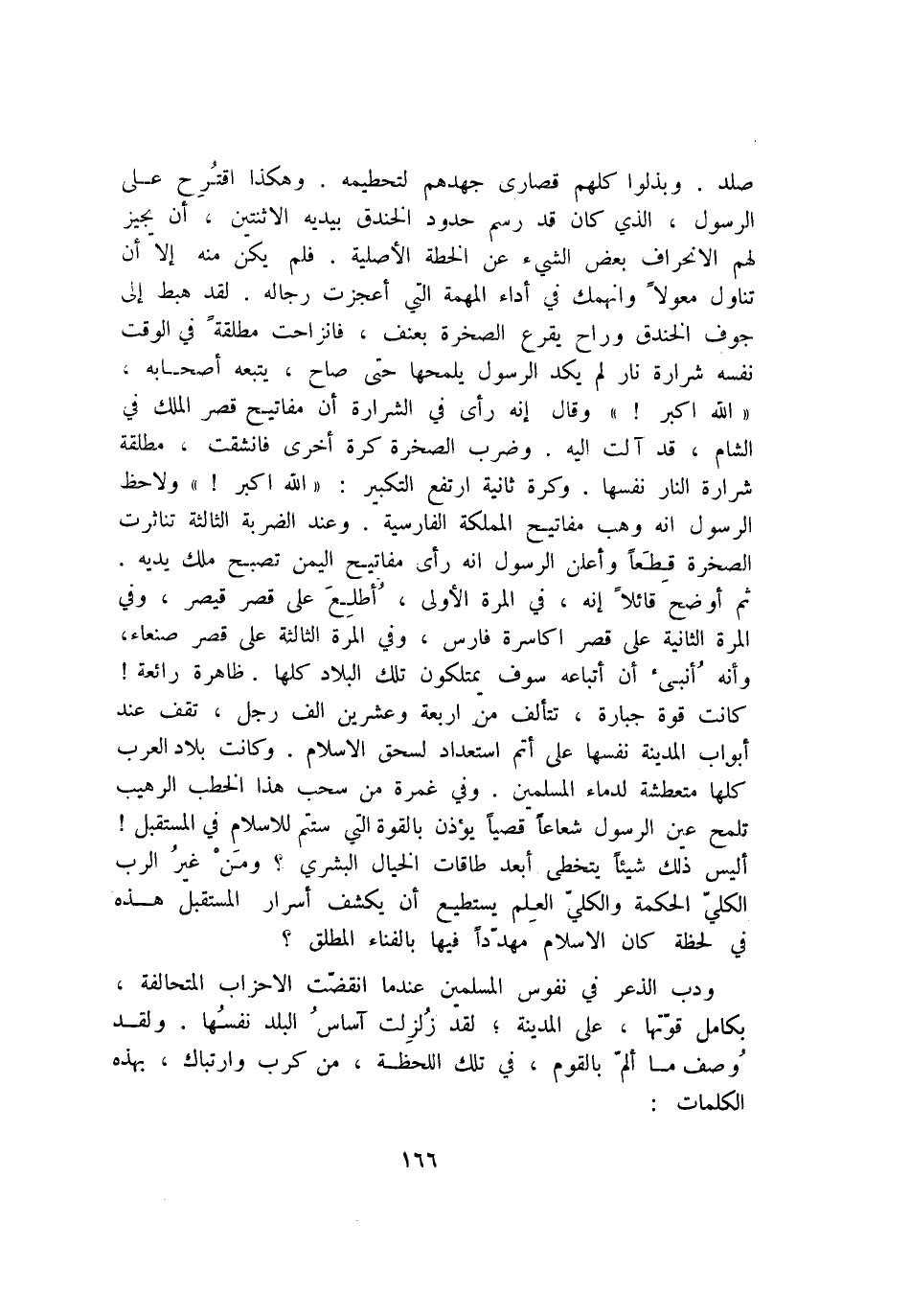 صلد. وبذلوا كلهم قصارى جهدهم لتحطيمه. وهكذا اقترح على الرسول، الذي كان قد رسم حدود الخندق بيديه الاثنين، أن يجيز لهم الانحراف بعض الشيء عن الخطة الأصلية. فلم يكن منه إلا أن تناول معولا وانهمك في أداء المهمة التي أعجزت رجاله. لقد هبط إلى جوف الخندق وراح يقرع الصخرة بعنف، فانزاحت مطلقة في الوقت نفسه شرارة نار لم يكد الرسول يلمحها حتى صاح، يتبعه أصحابه، «الله اكبر!» وقال إنه رأى في الشرارة أن مفاتيح قصر الملك في الشام، قد آلت اليه. وضرب الصخرة كرة أخرى فانشقت، مطلقة شرارة النار نفسها. وكرة ثانية ارتفع التكبير: «الله اكبر!» ولاحظ الرسول انه وهب مفاتيح المملكة الفارسية. وعند الضربة الثالثة تناثرت الصخرة قطعا وأعلن الرسول انه رأى مفاتيح اليمن تصبح ملك يديه.