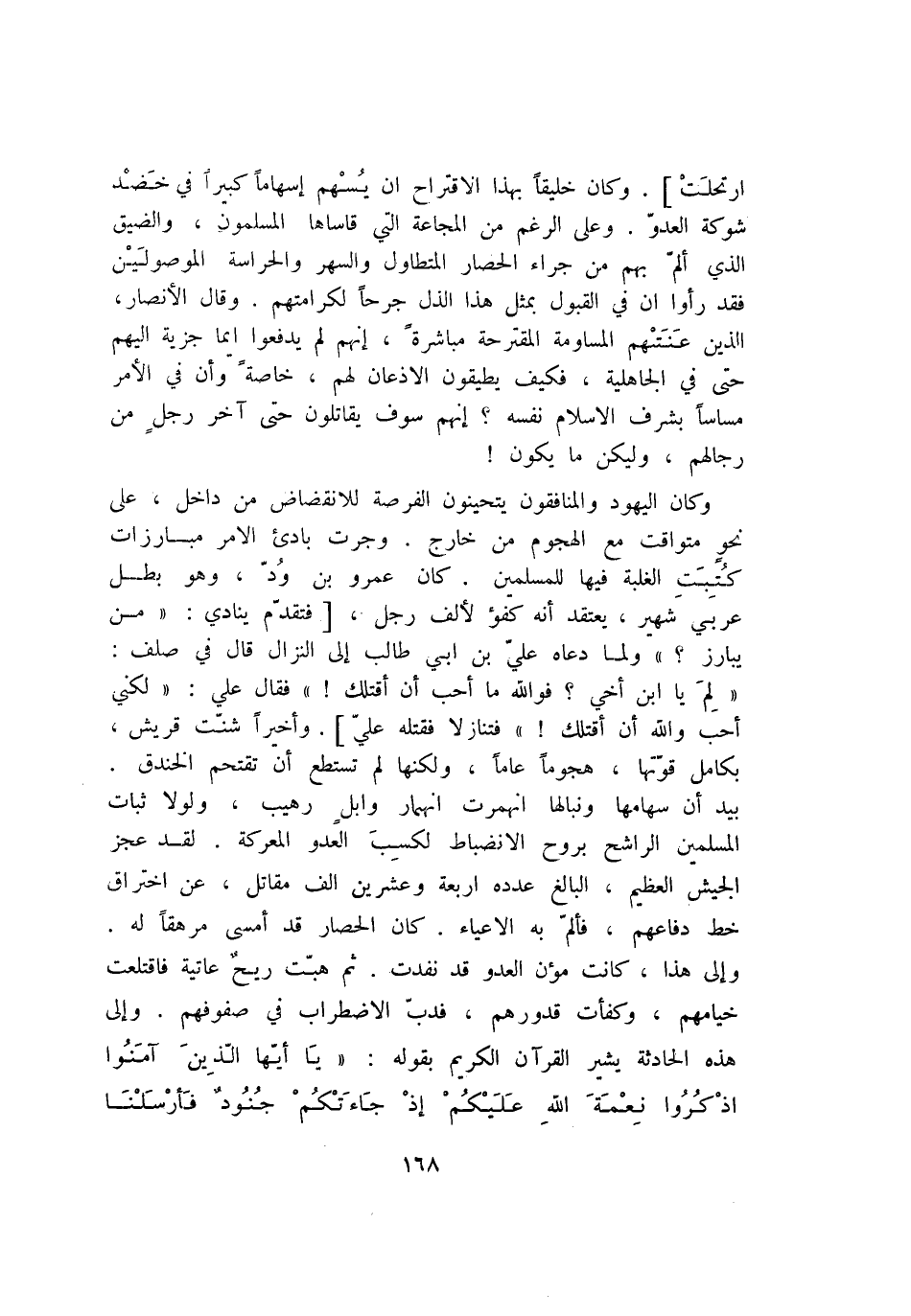 ارتحلت] . وكان خليقا بهذا الاقتراح ان يسهم إسهاما كبيرا في خضد شوكة العدوّ. وعلى الرغم من المجاعة التي قاساها المسلمون، والضيق الذي ألمّ بهم من جراء الحصار المتطاول والسهر والحراسة الموصولين فقد رأوا ان في القبول بمثل هذا الذل جرحا لكرامتهم. وقال الأنصار، الذين عنتهم المساومة المقترحة مباشرة، إنهم لم يدفعوا ايما جزية اليهم حتى في الجاهلية، فكيف يطيقون الاذعان لهم، خاصة وأن في الأمر مساسا بشرف الاسلام نفسه؟ إنهم سوف يقاتلون حتى آخر رجل من رجالهم، وليكن ما يكون!