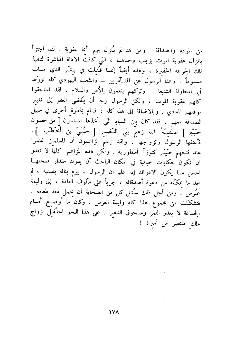 فأعتقها الرسول وتزوّجها. ولقد زعم الزاعمون أن المسلمين غنموا عند فتحهم خيبر كنوزا أسطورية. ولكن هذه المزاعم كلها لا تعدو أن تكون حكايات خيالية في إمكان الباحث أن يدرك مقدار صحتها أحسن ما يكون الادراك إذا علم ان الرسول، يوم بنائه بصفية، لم يجد ما يمكّنه من دعوة أصدقائه، جريا على مألوف العادة، إلى وليمة عرس. ومن أجل ذلك سئل كل من الصحابة أن يحمل معه طعامه.