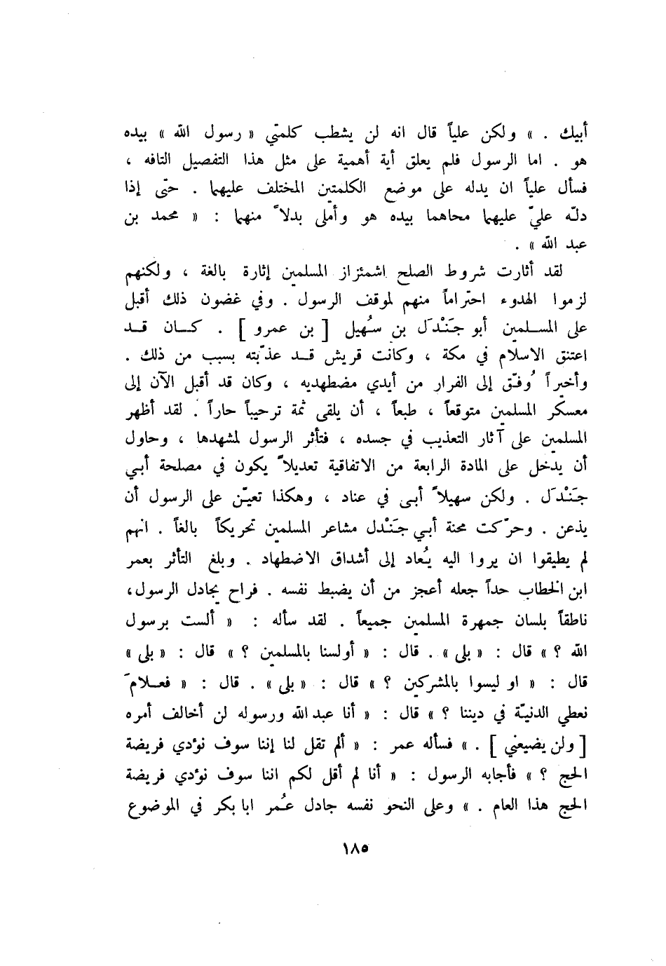 أبيك.» ولكن عليا قال انه لن يشطب كلمتي «رسول الله» بيده هو. اما الرسول فلم يعلق أية أهمية على مثل هذا التفصيل التافه، فسأل عليا ان يدله على موضع الكلمتين المختلف عليهما. حتى إذا دلّه عليّ عليهما محاهما بيده هو وأملى بدلا منهما: «محمد بن عبد الله» .