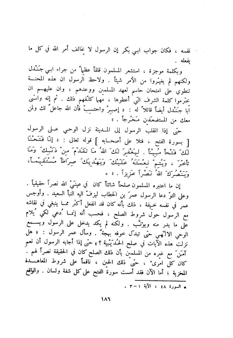 كان كل امرئ، حتى ذلك الحين، ناقما على شروط المعاهدة المخزية؛ أما الآن فقد أمست سورة الفتح على كل شفة ولسان. والواقع