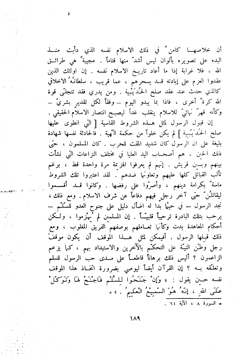 إن قبول الرسول لمثل هذه الشروط القاسية [التي انطوى عليها صلح الحديبية] لم يكن خلوا من حكمة الهية. فالحادثة نفسها شهادة بليغة على ان الرسول كان شديد المقت للحرب. كان المسلمون، حتى ذلك الحين، هم أصحاب اليد العليا في مختلف النزاعات التي نشأت بينهم وبين قريش. إنهم لم يعرفوا الهزيمة مرة واحدة قط، برغم تألب القبائل كلها عليهم وتعاونها ضدهم. لقد اعتبروا تلك الشروط ماسة بكرامة دينهم، وأصرّوا على رفضها. وكانوا قد أقسموا ليقاتلنّ حتى آخر رجل فيهم دفاعا عن شرف الاسلام. ومع ذلك، نجد الرسول- في حيثما بدا له اضأل دليل على جنوح العدو للسّلم- يرحب بتلك البادرة ترحيبا قلبيّا. إن المسلمين لم يهزموا، ولكن أحكام المعاهدة بدت وكأنها تعاملهم بوصفهم الفريق المغلوب، ومع ذلك قبلها الرسول. أفيمكن لمثل هذا الموقف أن يكون موقف رجل وطّن النيّة على التحكّم بالآخرين والاستبداد بهم، كما يزعم الزاعمون؟ أليس ذلك برهانا قاطعا على مدى حب الرسول للسلم وتعلّقه به؟ إن القرآن أيضا ليوصي بضرورة اتخاذ هذا الموقف نفسه حين يقول: «وَإِنْ جَنَحُوا لِلسَّلْمِ فَاجْنَحْ لَها وَتَوَكَّلْ عَلَى اللَّهِ، إِنَّهُ هُوَ السَّمِيعُ الْعَلِيمُ.» *
