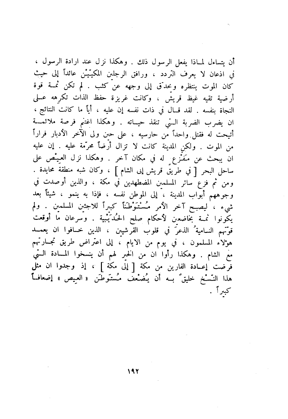 أن يتساءل لماذا يفعل الرسول ذلك. وهكذا نزل عند ارادة الرسول، في اذعان لا يعرف التردد، ورافق الرجلين المكيّين عائدا إلى حيث كان الموت ينتظره ويحدّق إلى وجهه عن كثب. لم تكن ثمة قوة أرضية تقيه غيظ قريش، وكانت غريزة حفظ الذات تكرهه على النجاة بنفسه. لقد قال في ذات نفسه إن عليه، أيا ما كانت النتائج، ان يضرب الضربة التي تنقذ حياته. وهكذا اغتنم فرصة ملائمة أتيحت له فقتل واحدا من حارسيه، على حين ولى الآخر الأدبار فرارا من الموت. ولكن المدينة كانت لا تزال أرضا محرّمة عليه. إن عليه ان يبحث عن مفزع له في مكان آخر. وهكذا نزل العيص على ساحل البحر [في طريق قريش إلى الشام] ، وكان شبه منطقة محايدة.