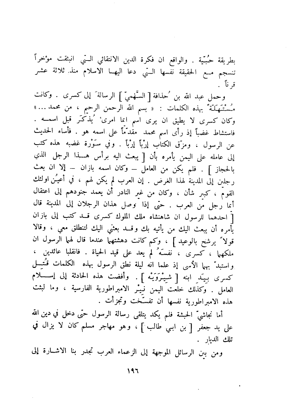 فاستشاط غضبا إذ رأى اسم محمد مقدّما على اسمه هو. فأساء الحديث عن الرسول، ومزّق الكتاب إربا إربا. وفي سورة غضبه هذه كتب إلى عامله على اليمن يأمره بأن [يبعث اليه برأس هذا الرجل الذي بالحجاز] . فلم يكن من العامل- وكان اسمه بازان- إلا ان بعث رجلين إلى المدينة لهذا الغرض. إن العرب لم يكن لهم، في أعين اولئك القوم، كبير شأن، وكان من غير النادر أن يعمد جنودهم إلى اعتقال أيما رجل من العرب. حتى إذا وصل هذان الرجلان إلى المدينة قال [احدهما للرسول ان شاهنشاه ملك الملوك كسرى قد كتب إلى بازان يأمره أن يبعث اليك من يأتيه بك وقد بعثني اليك لتنطلق معي، وقالا قولا يرشح بالوعيد] ، وكم كانت دهشتهما عندما قال لهما الرسول ان ملكهما، كسرى، نفسه لم يعد على قيد الحياة. فانقلبا عائدين، واستبدّ بهما الأسى إذ علما انه ليلة نطق الرسول بهذه الكلمات قتل كسرى بيد ابنه [شيرويه] . وأفضت هذه الحادثة إلى إسلام العامل. وكذلك خلعت اليمن نير الامبراطورية الفارسية، وما لبثت هذه الامبراطورية نفسها أن تفسّخت وتجزأت.