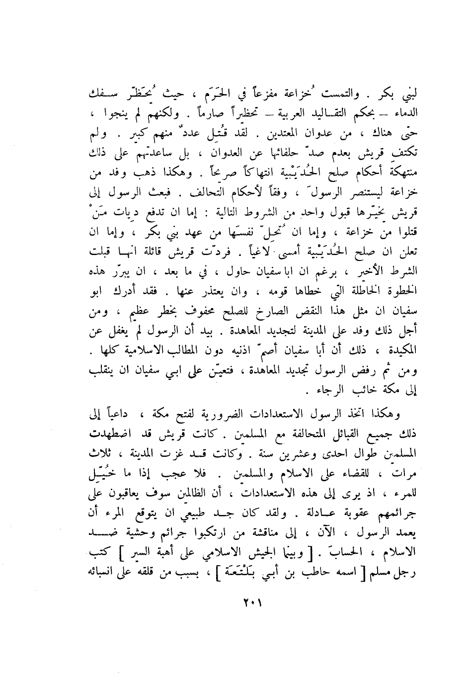 وهكذا اتخذ الرسول الاستعدادات الضرورية لفتح مكة، داعيا إلى ذلك جميع القبائل المتحالفة مع المسلمين. كانت قريش قد اضطهدت المسلمين طوال احدى وعشرين سنة. وكانت قد غزت المدينة، ثلاث مرات، للقضاء على الاسلام والمسلمين. فلا عجب إذا ما خيّل للمرء، إذ يرى إلى هذه الاستعدادات، أن الظالمين سوف يعاقبون على جرائمهم عقوبة عادلة. ولقد كان جد طبيعي ان يتوقع المرء أن يعمد الرسول، الآن، إلى مناقشة من ارتكبوا جرائم وحشية ضد الاسلام، الحساب. [وبينما الجيش الاسلامي على أهبة السير] كتب رجل مسلم [اسمه حاطب بن أبي بلتعة] ، بسبب من قلقه على انسبائه